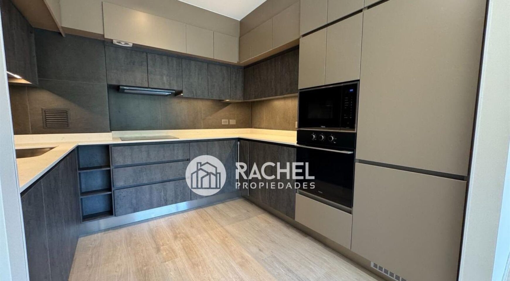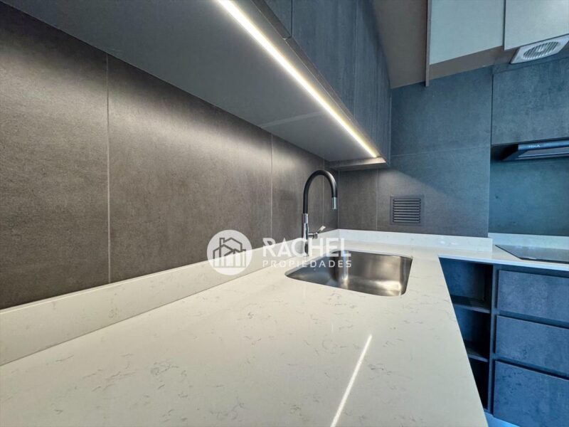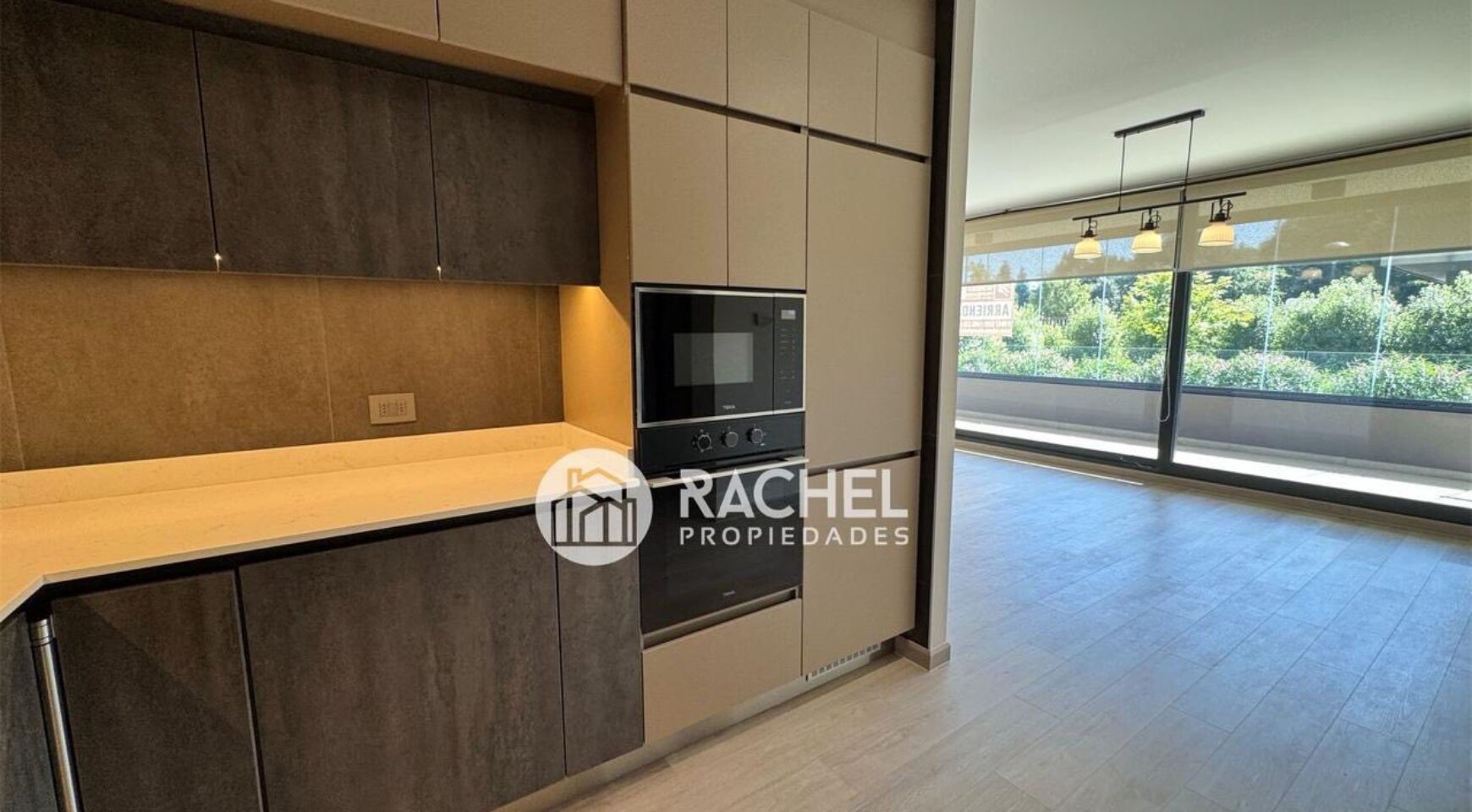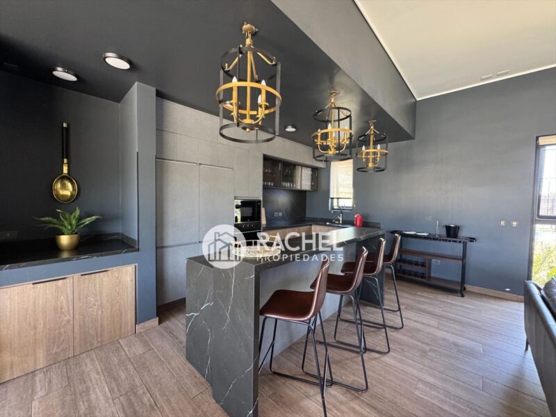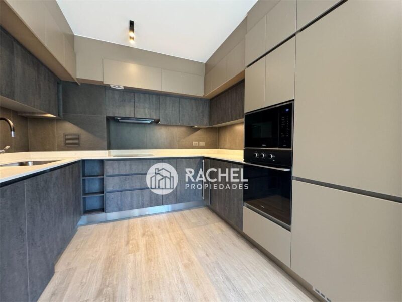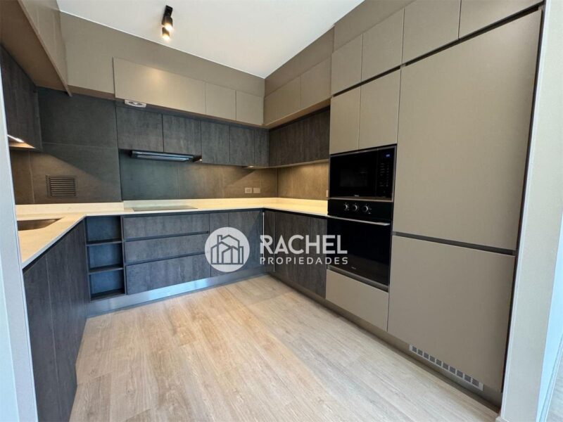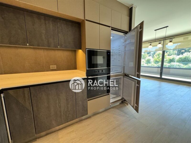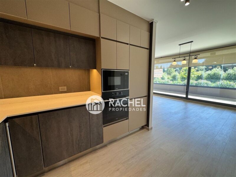 Amplio y cómodo living comedor, con cocina integrada, full equipado con horno, encimera, campana, refrigerador, y salida a gran terraza