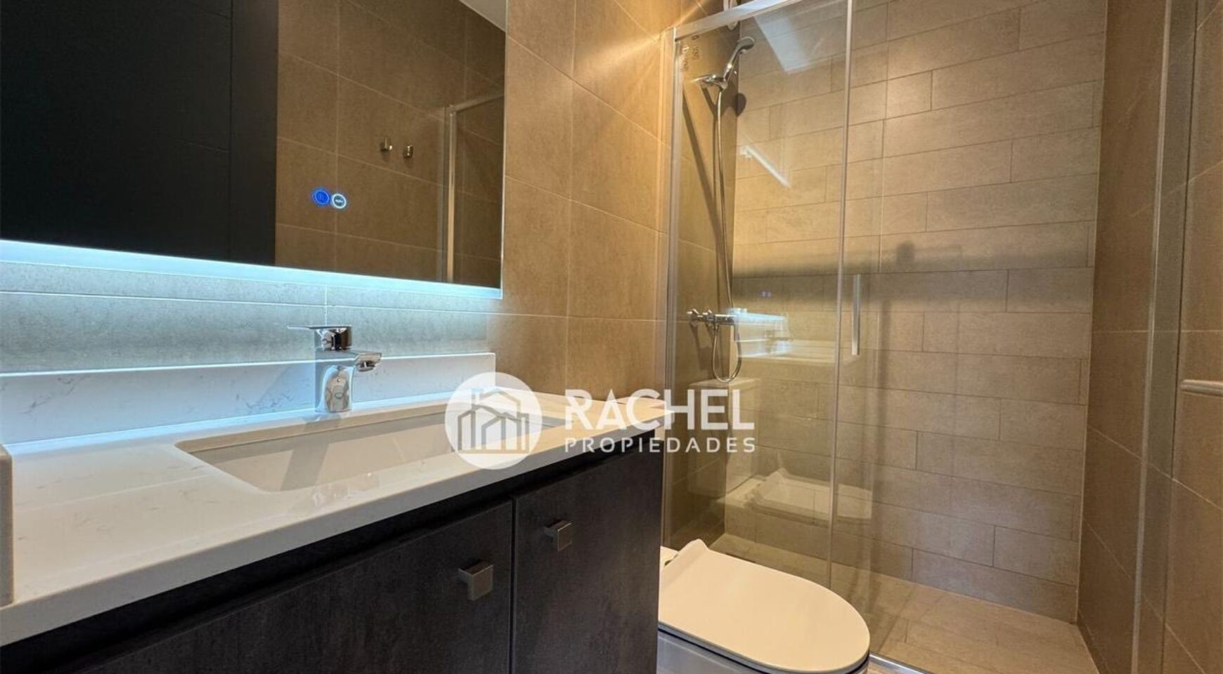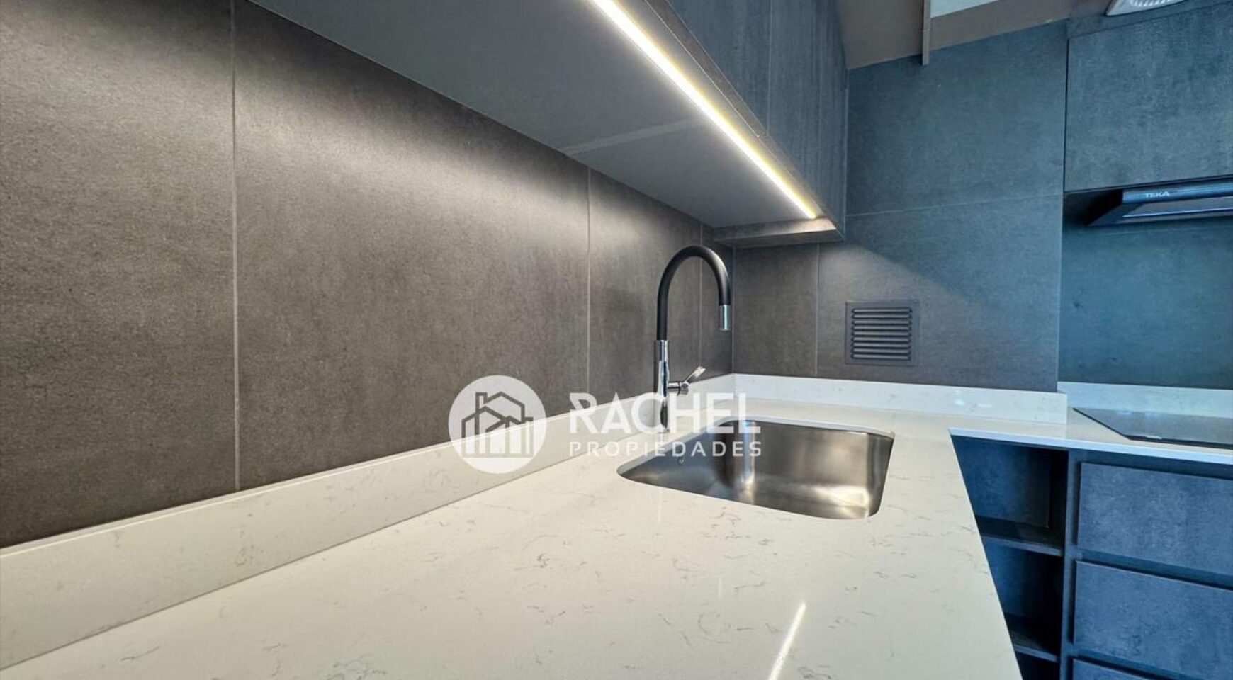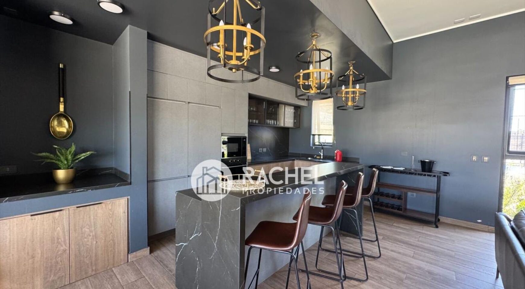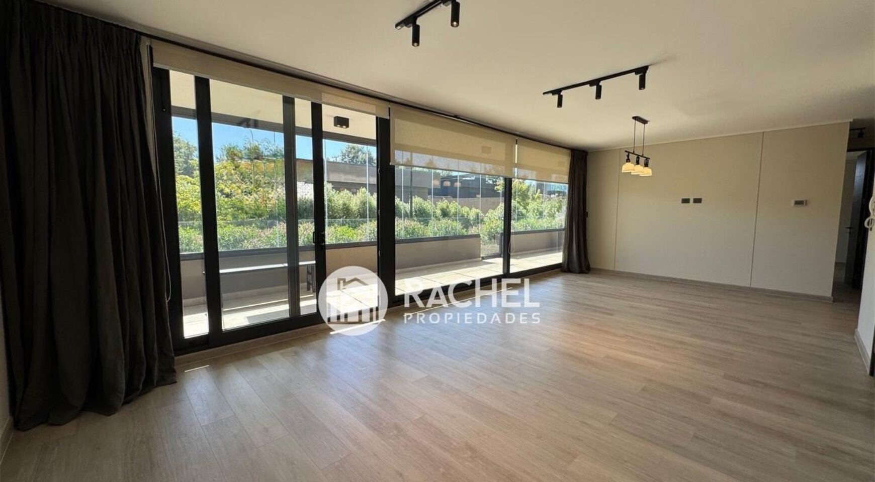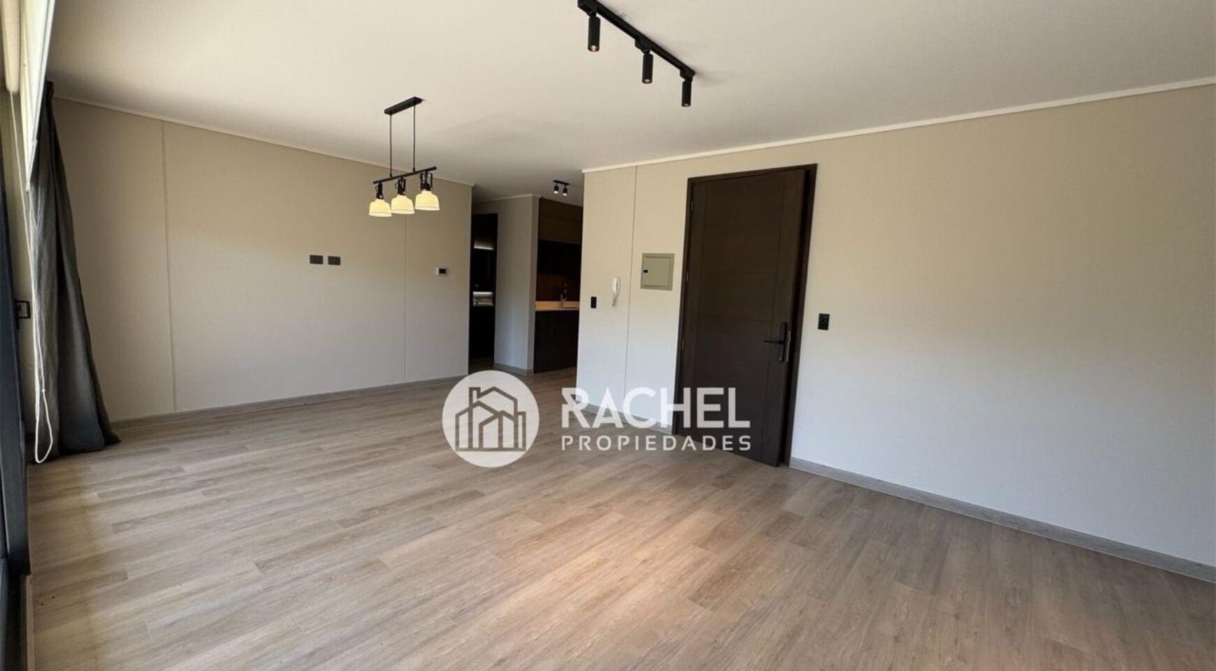 Amplio y cómodo living comedor, con cocina integrada, full equipado con horno, encimera, campana, refrigerador, y salida a gran terraza