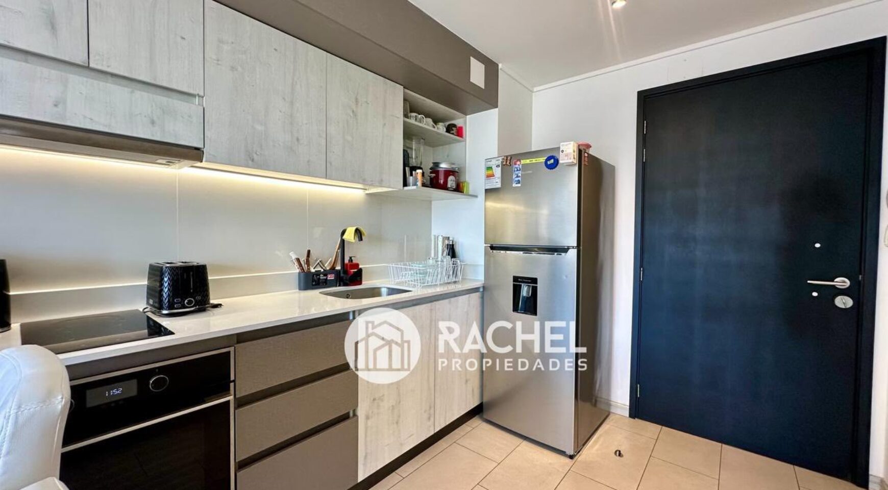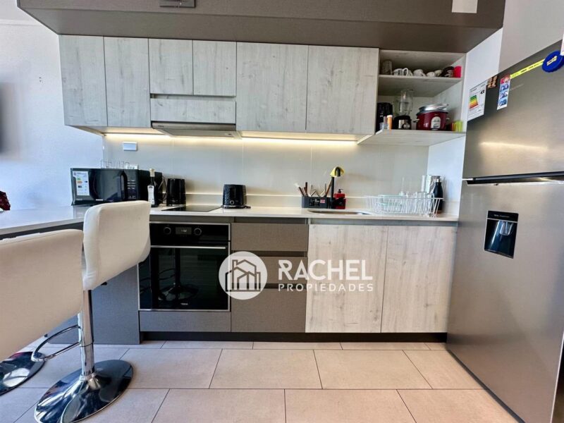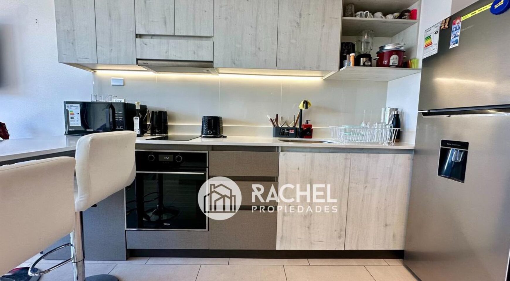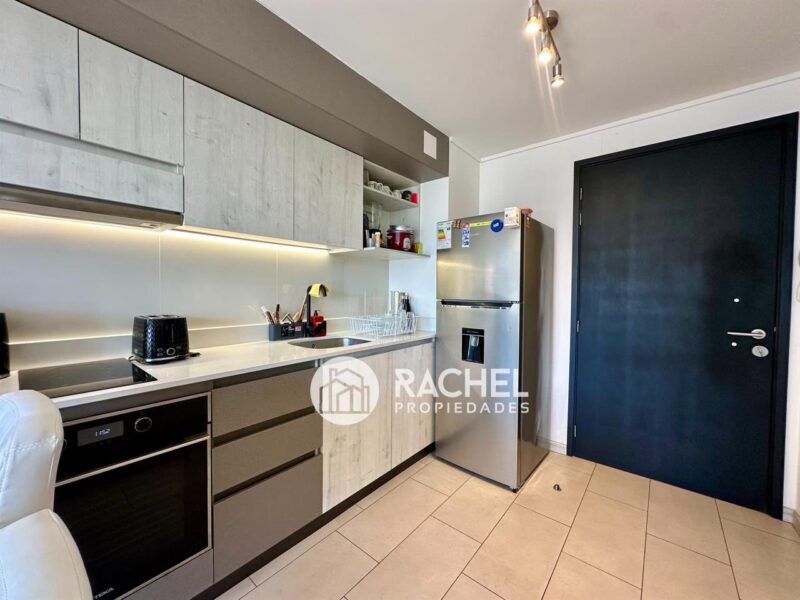 Cocina con cubierta de Quarzo y equipada con campana, encimera vitrocerámica y horno con sistema touch control, espacio para refrigerador