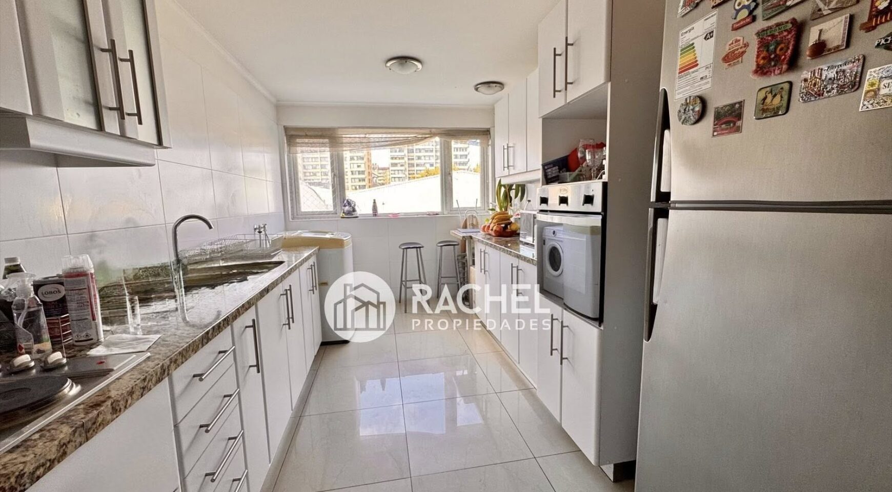 Cocina cerrada, amoblada incluye horno, encimera, microondas empotrado y campana, conexión para lavadora cubiertas de granito, espacio