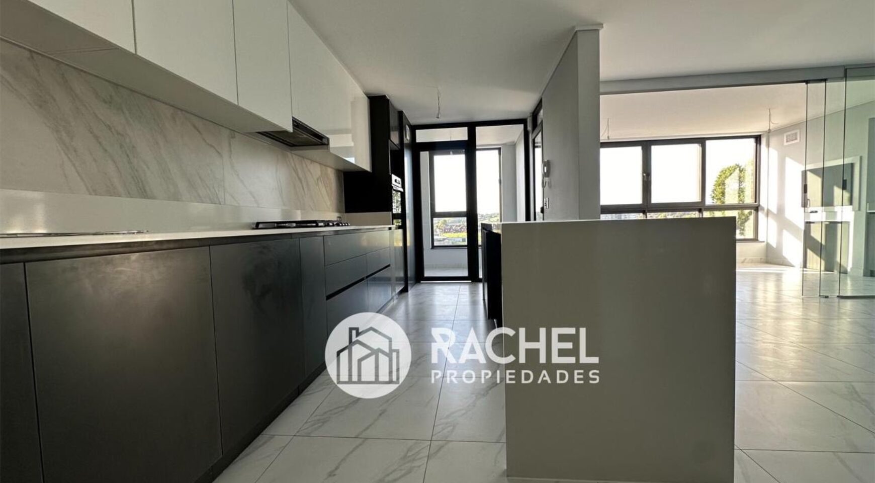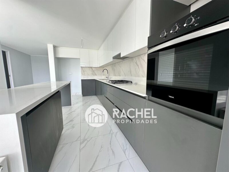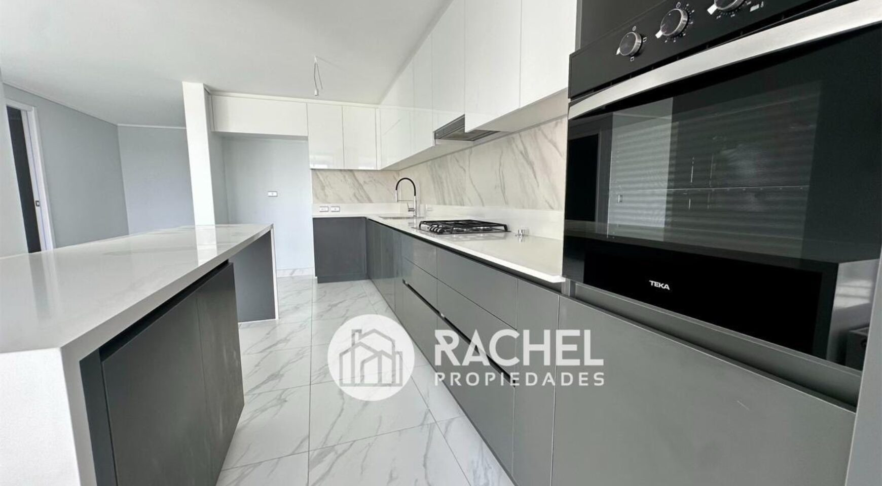 Gran cocina equipada con elegante diseño cubiertas de Quarzo, encimera a gas horno eléctrico