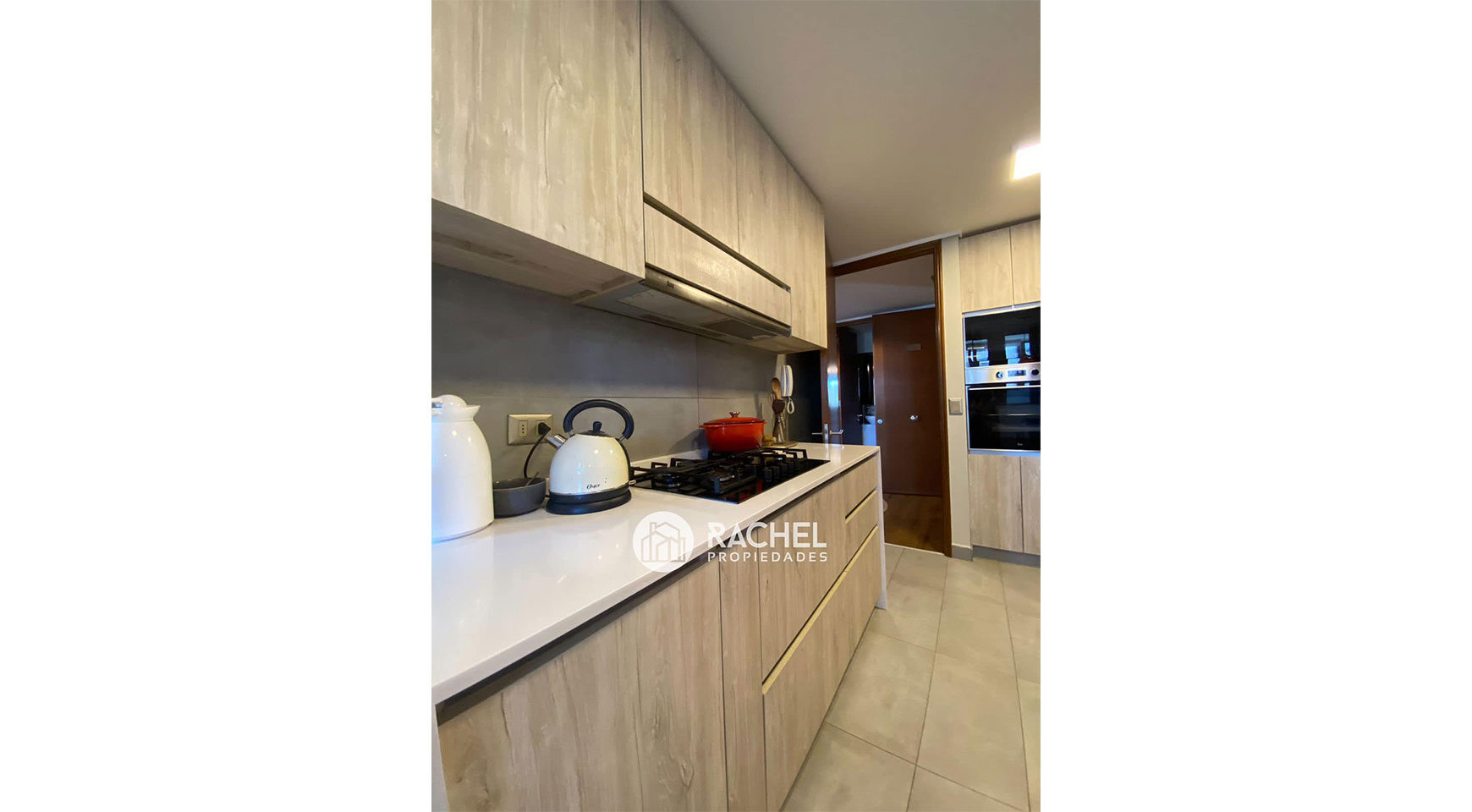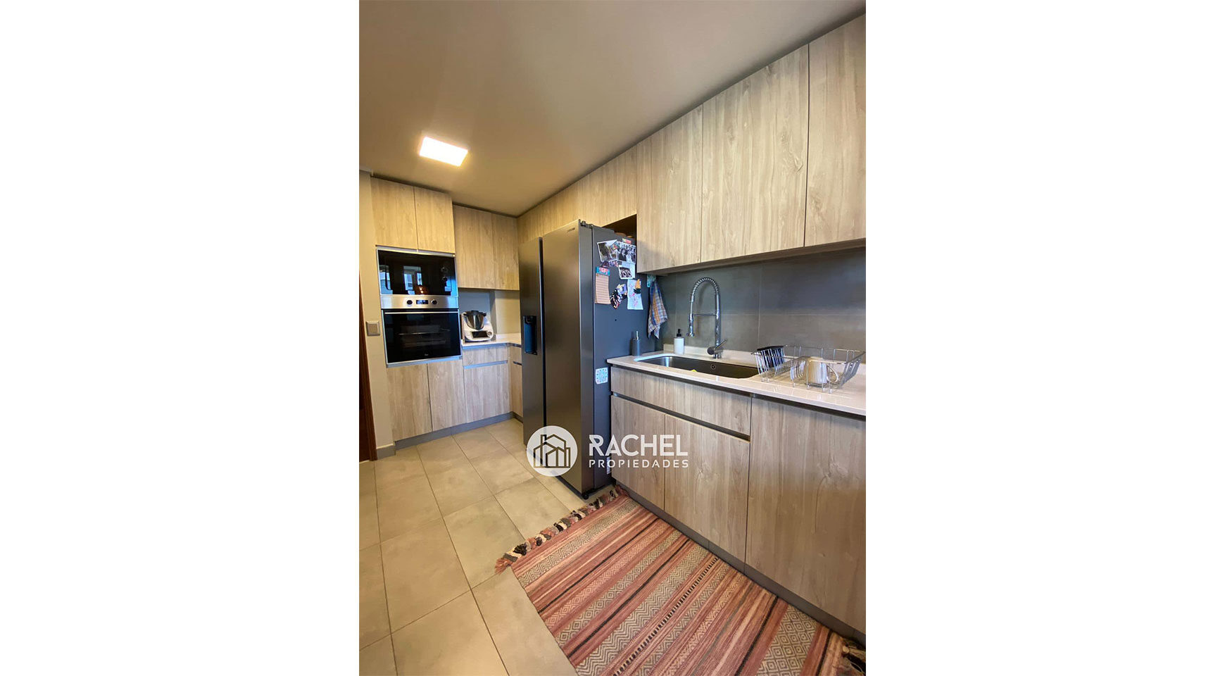 amplia cocina muy equipada, con campana extractora, encimera de 5 platos , horno eléctrico, microondas y lavavajillas. Cubiertas de cuarzo, espacio para refrigerador side by side, comedor de diario