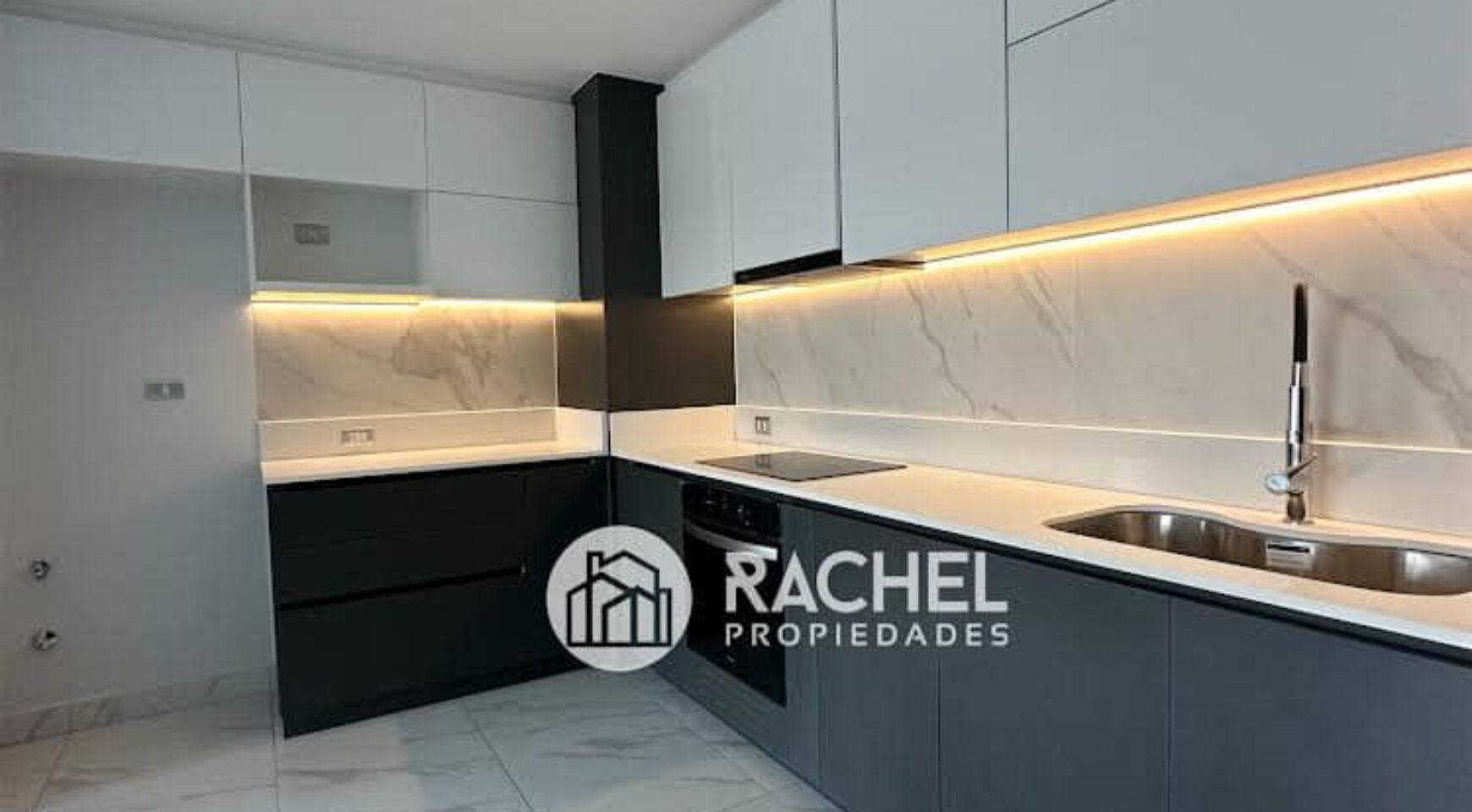 Cocina incorporada cubiertas de Quarzo, instalación para lavadora, amplios gabinetes
