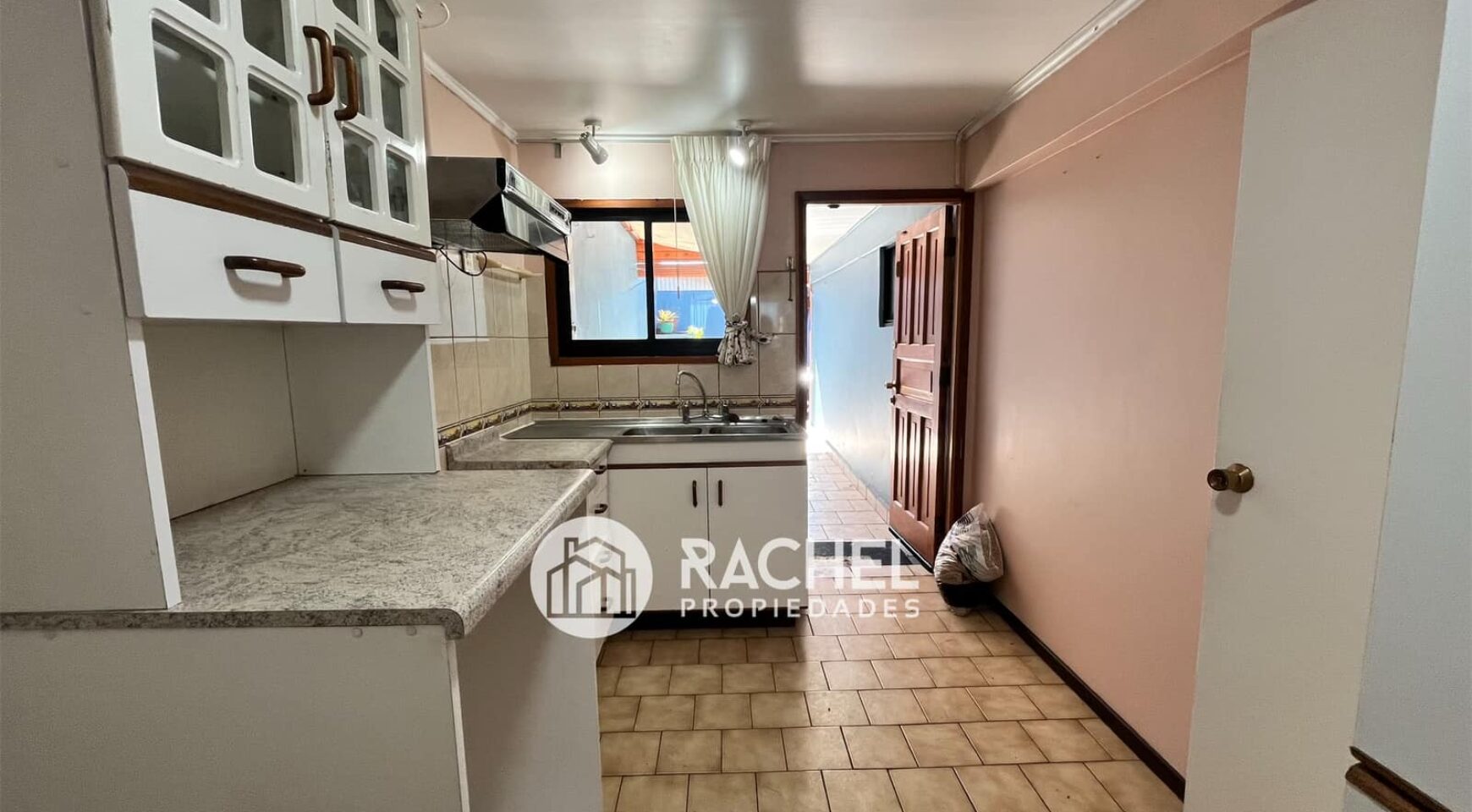amplia cocina amoblada, con espacio para comedor de diario y cocina a leña