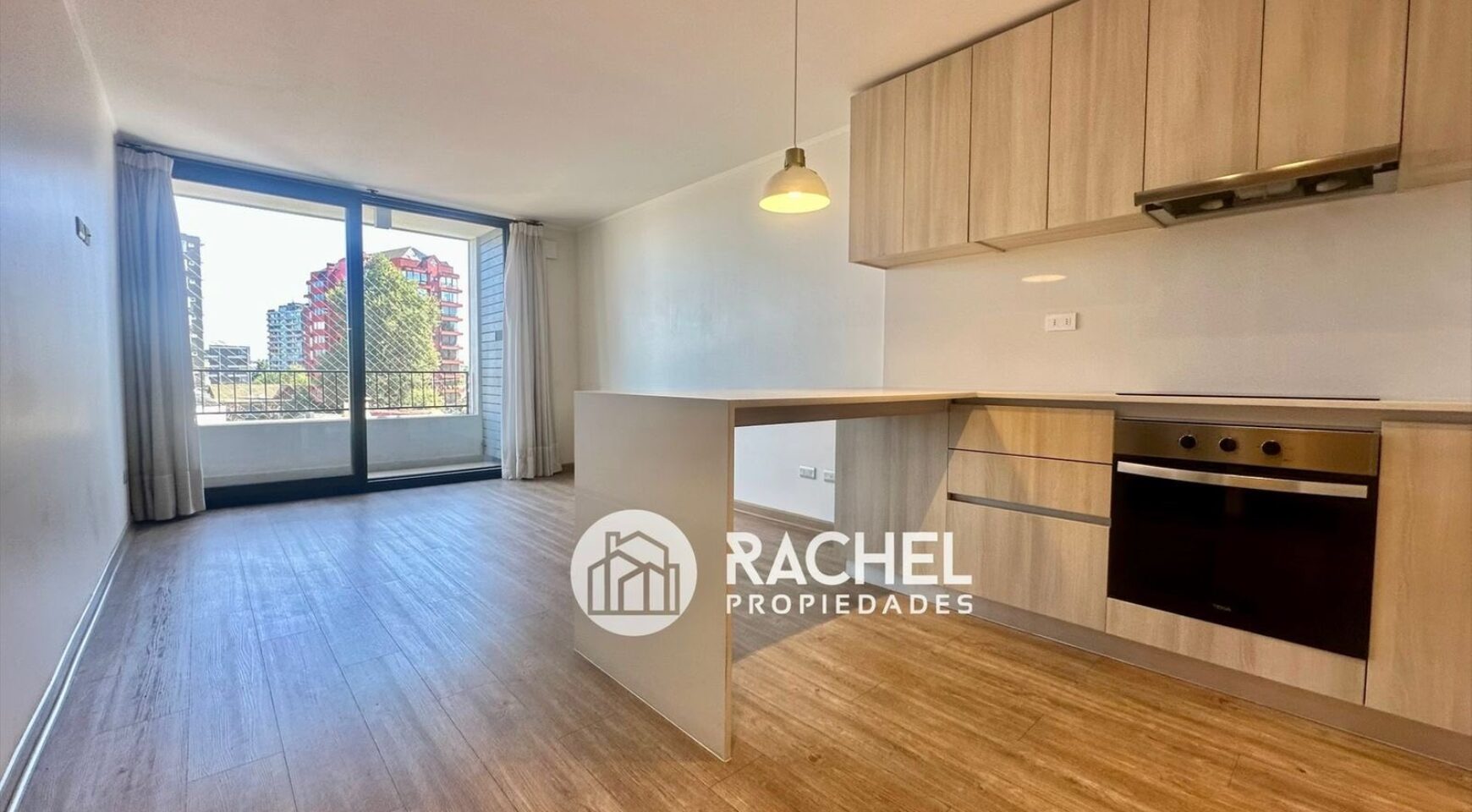 cómodo e iluminado Living comedor con cocina concepto abierto, con salida a terraza de 10 mts2