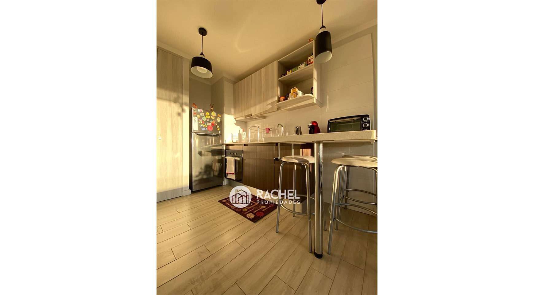 cubiertas de granito incluye encimera, horno, campana, refrigerador y taburetes