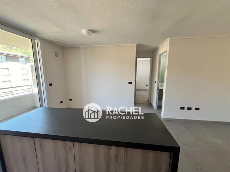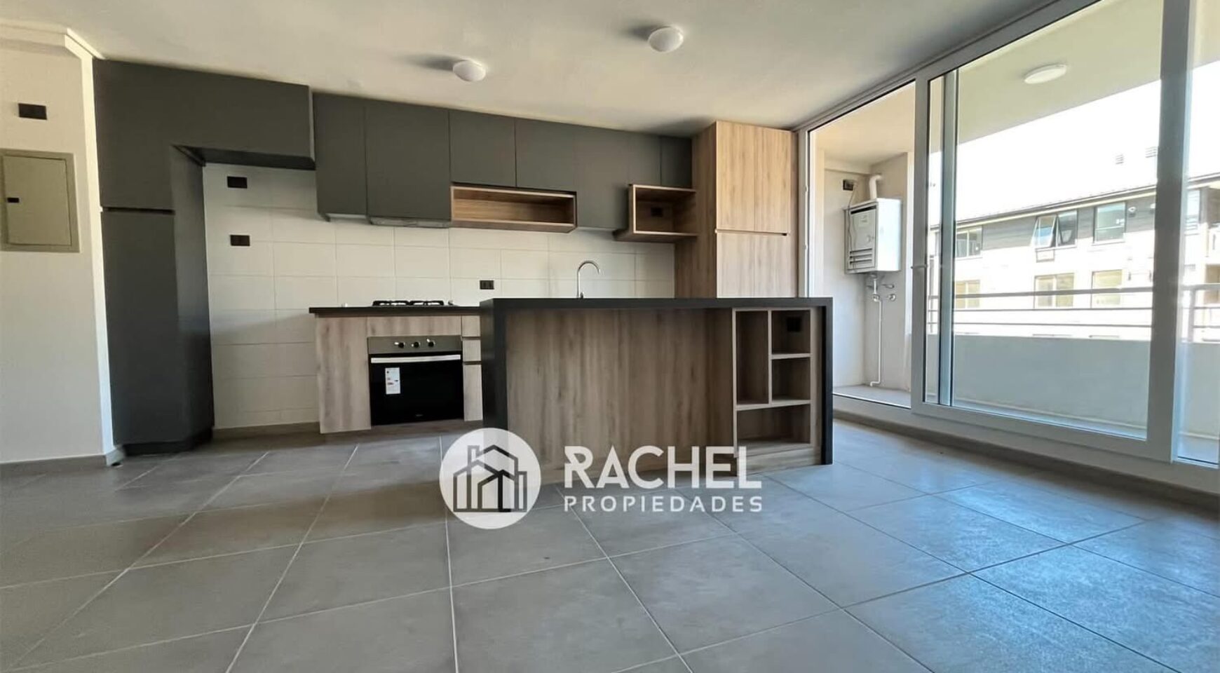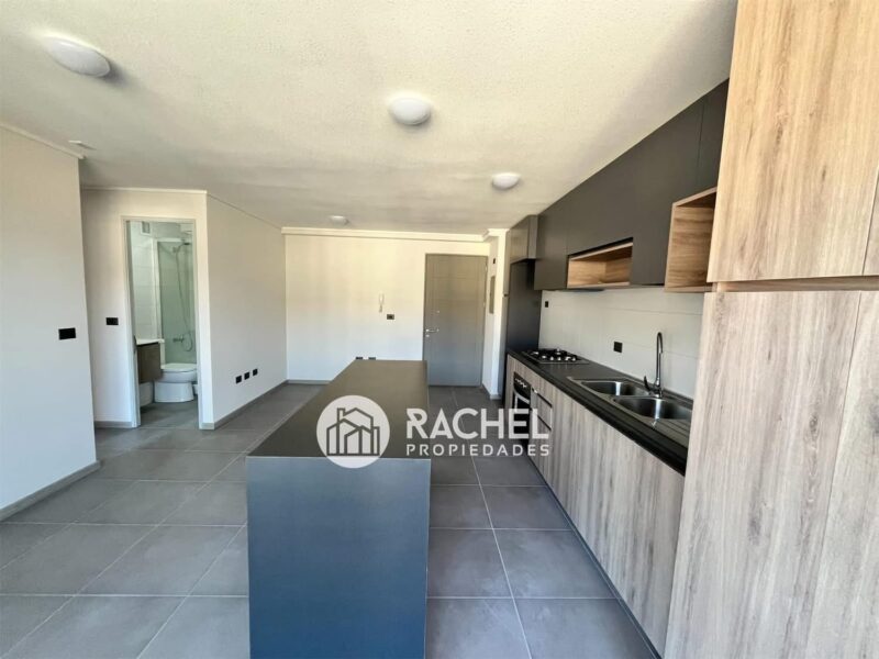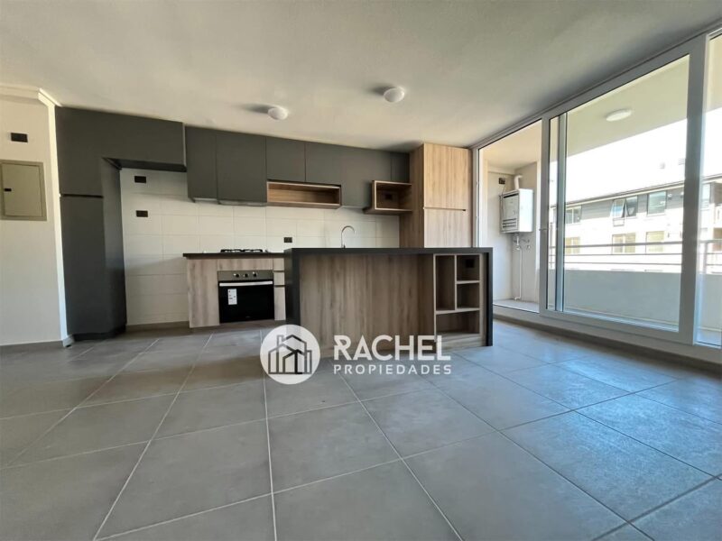 amplio o living comedor con cocina incorporada, con mueble isla, horno, encimera, campana extractora