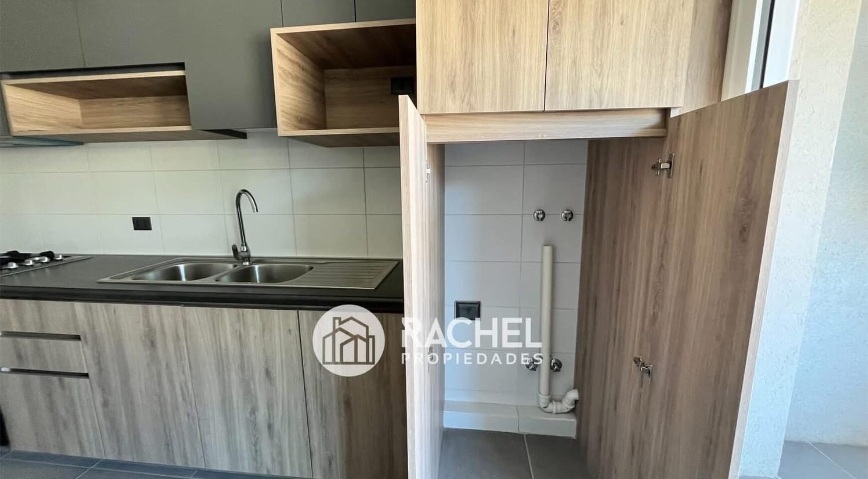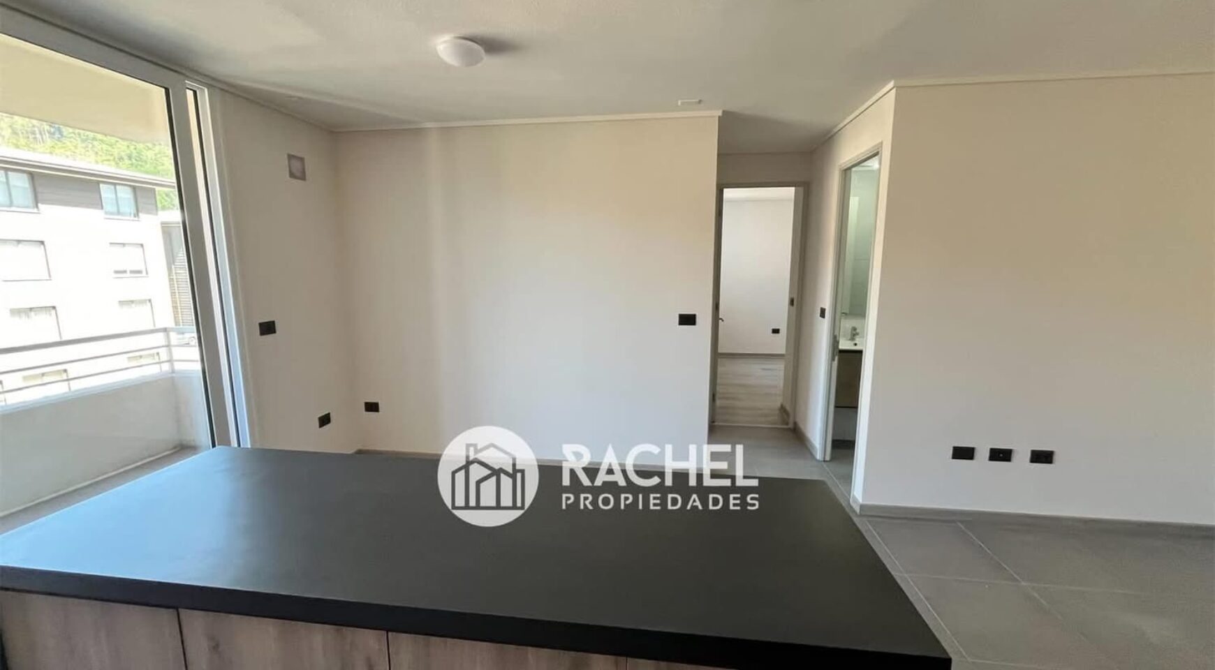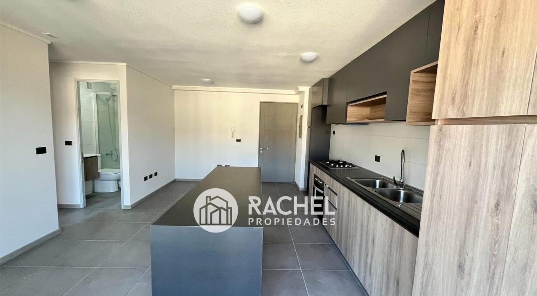 amplio o living comedor con cocina incorporada, con mueble isla, horno, encimera, campana extractora