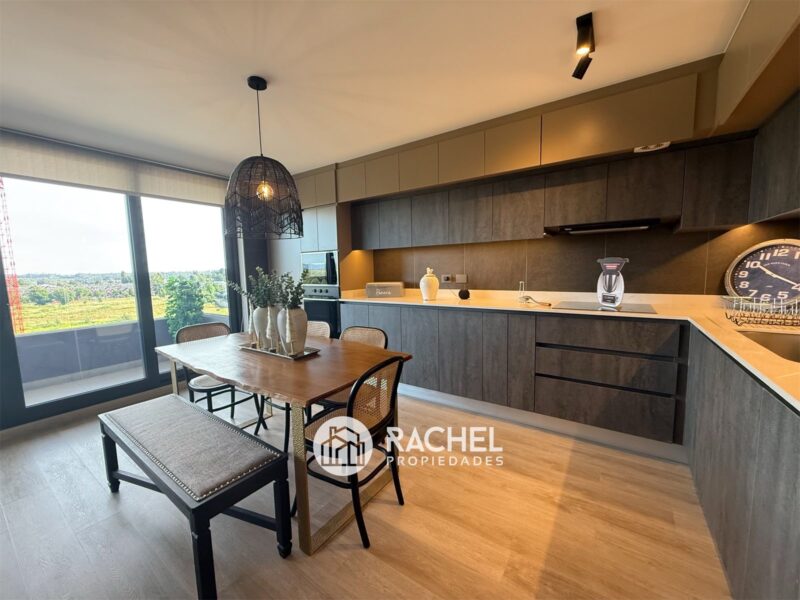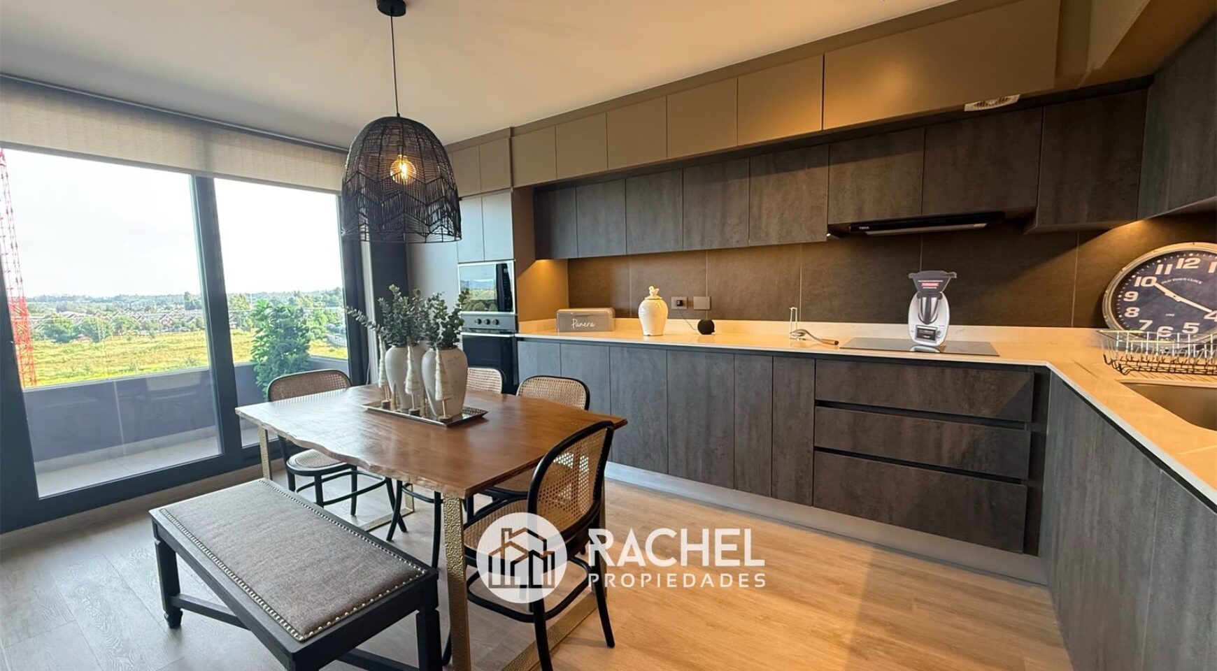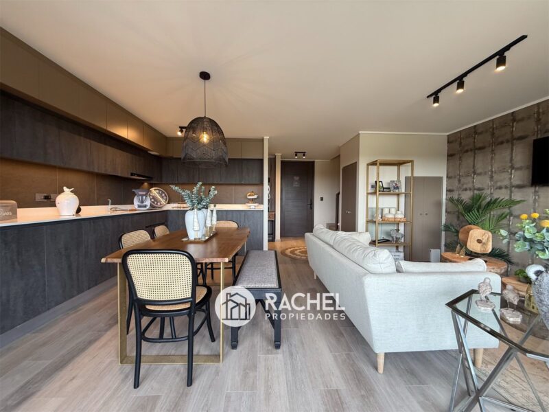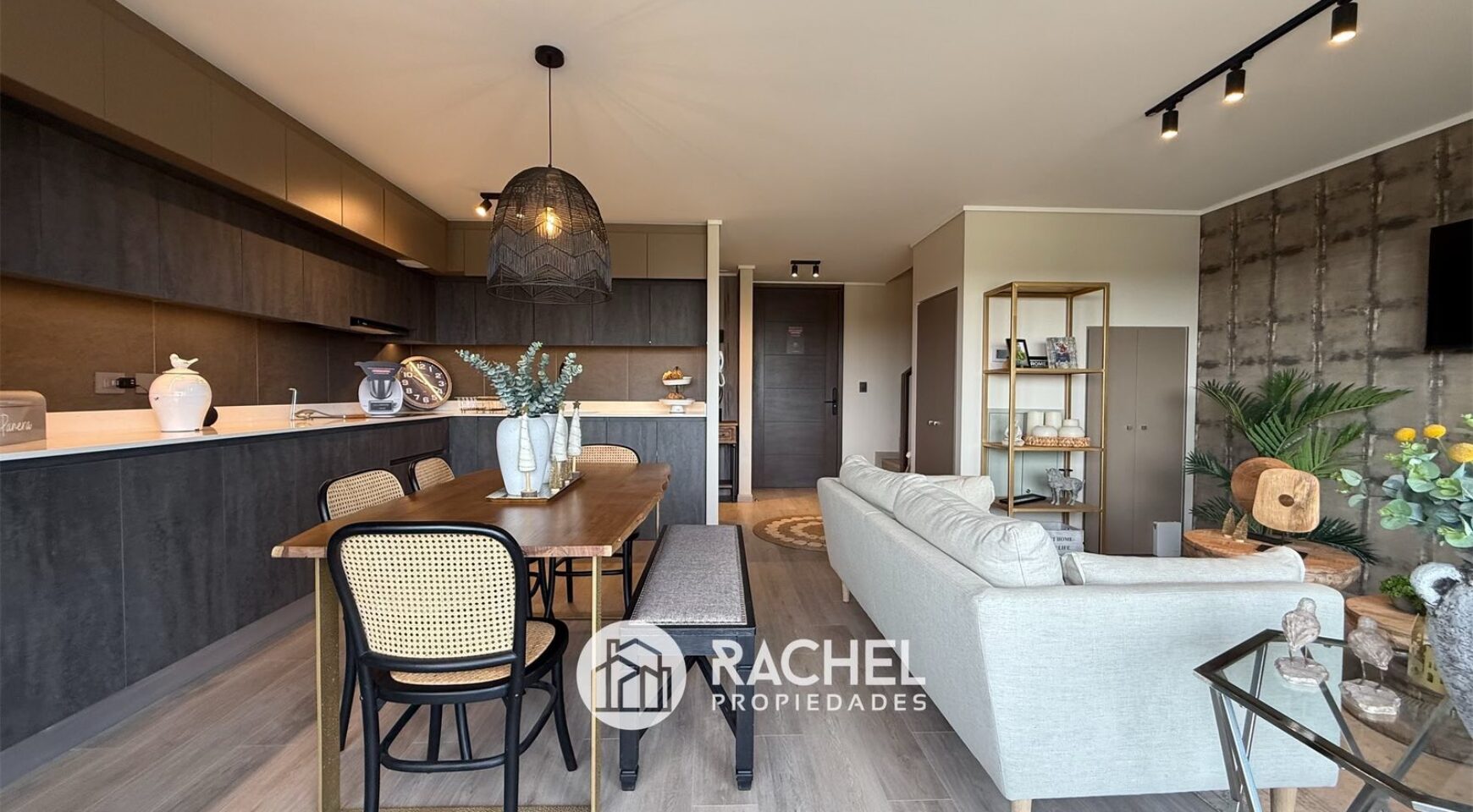 Amplio y cómodo living comedor, con cocina integrada, full equipado con horno, encimera, campana, refrigerador, y salida a gran terraza.