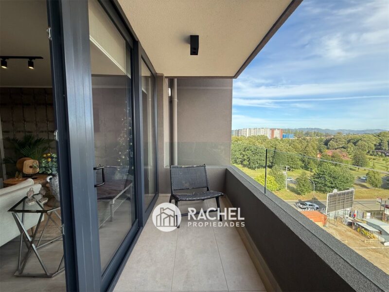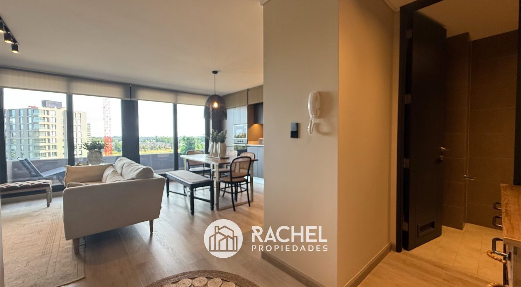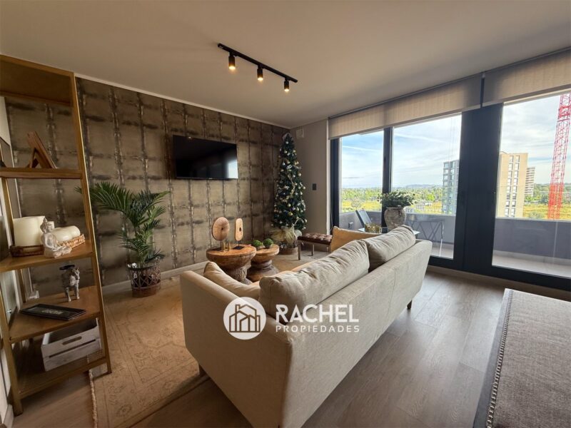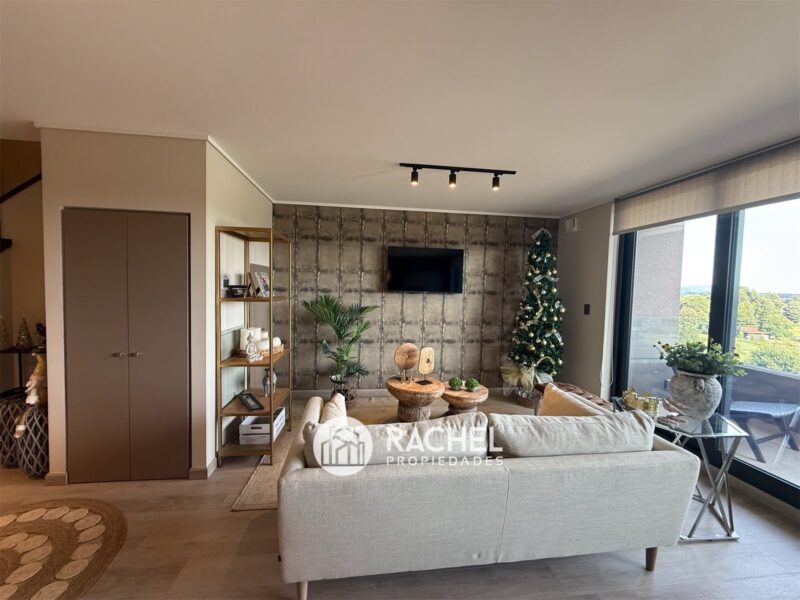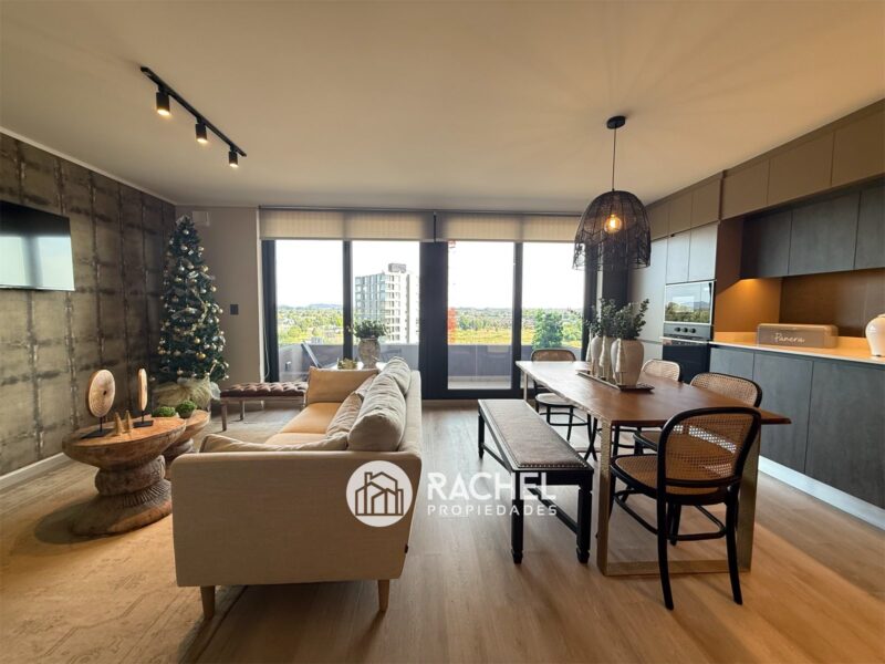 Amplio y cómodo living comedor, con cocina integrada, full equipado con horno, encimera, campana, refrigerador, y salida a gran terraza.