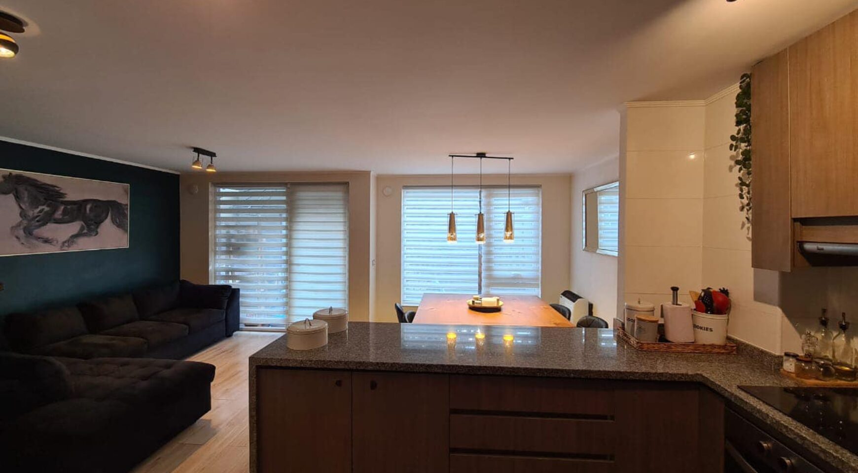 Primer piso: living y comedor con estufa mural a gas, piso foto laminado, y cocina americana equipada con piso y muros de porcelanato, horno, encimera digital, extractor y grifería teka, cubiertas de granito y baño de visitas.