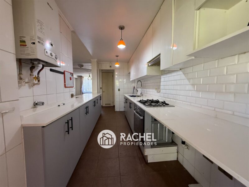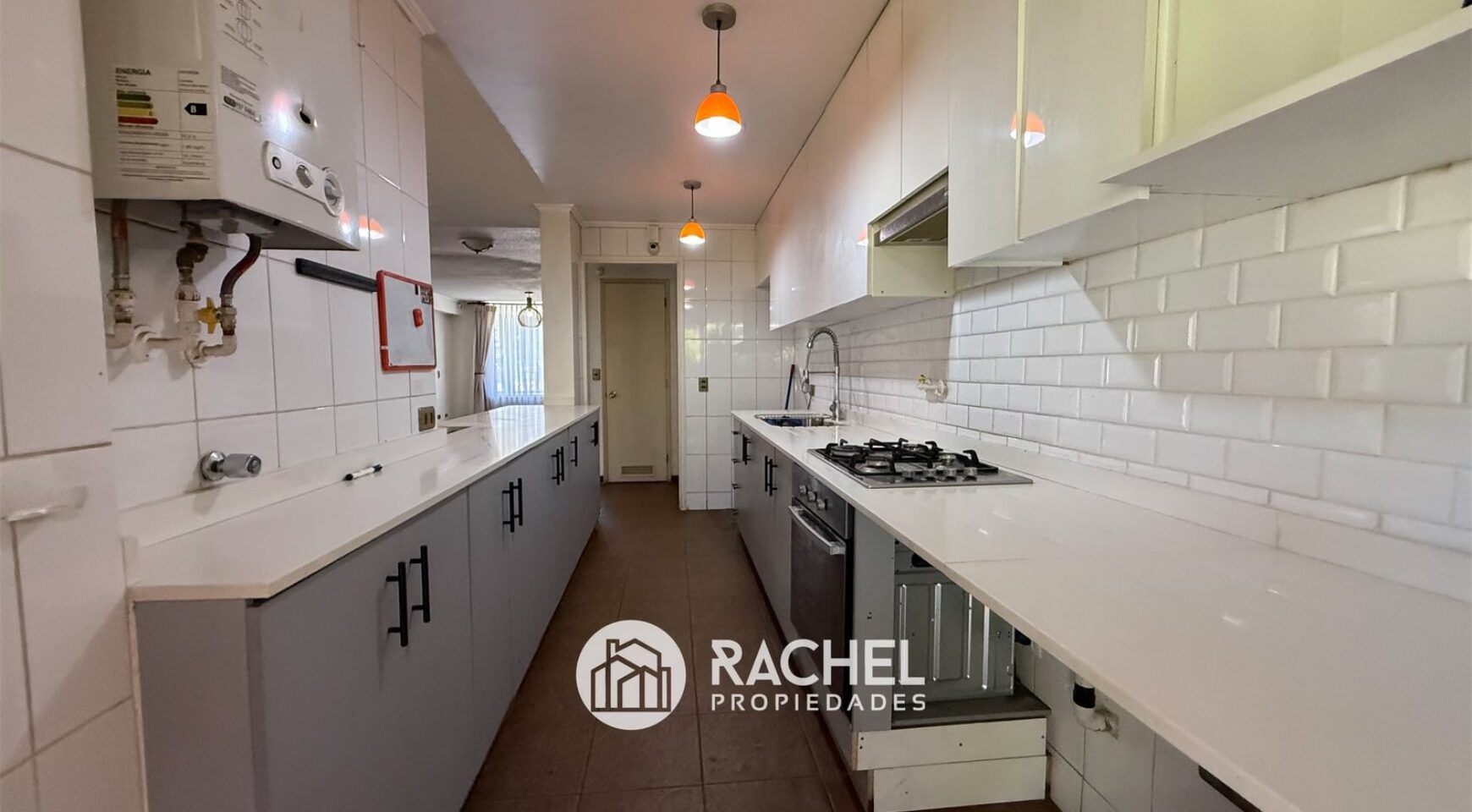 Cocina completamente remodelada con cubiertas de cuarzo, horno, encimera y campana.