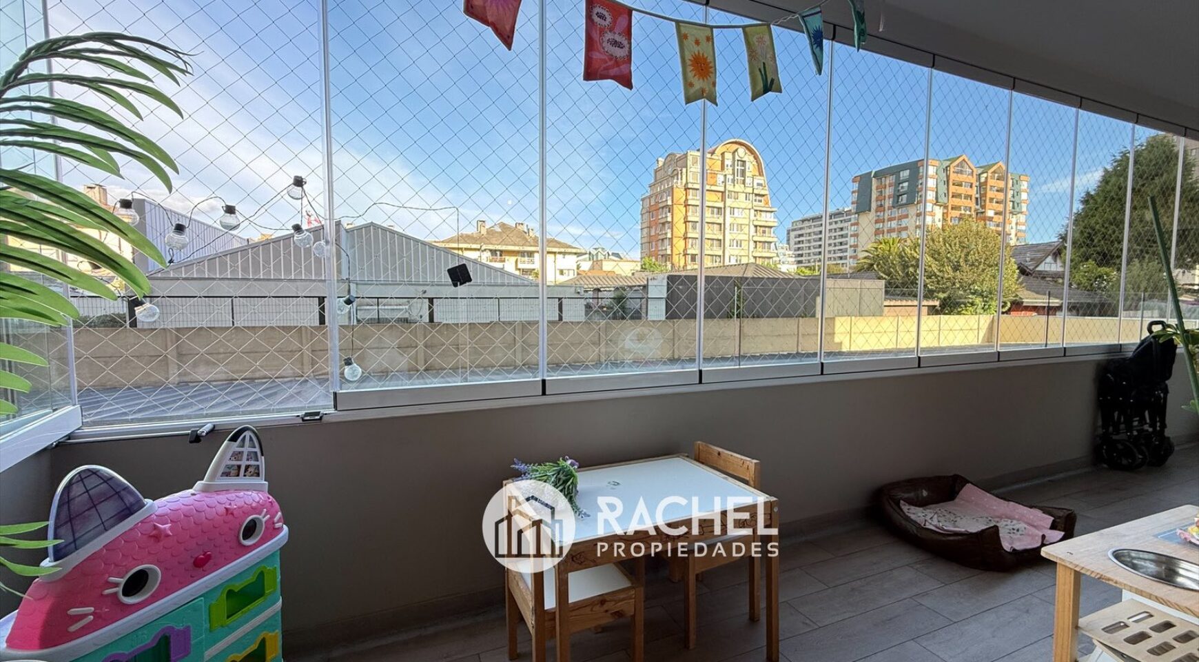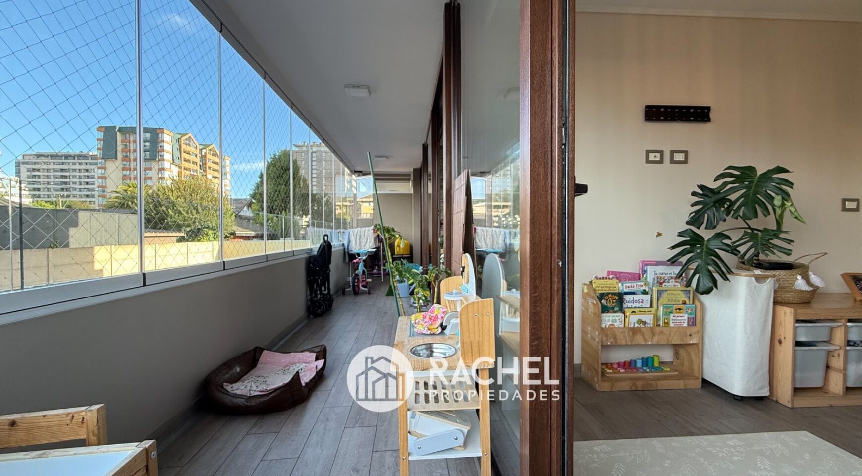 Gran terraza con cierre de cristal plegable y mallas, con acceso desde ambos dormitorios y living comedor