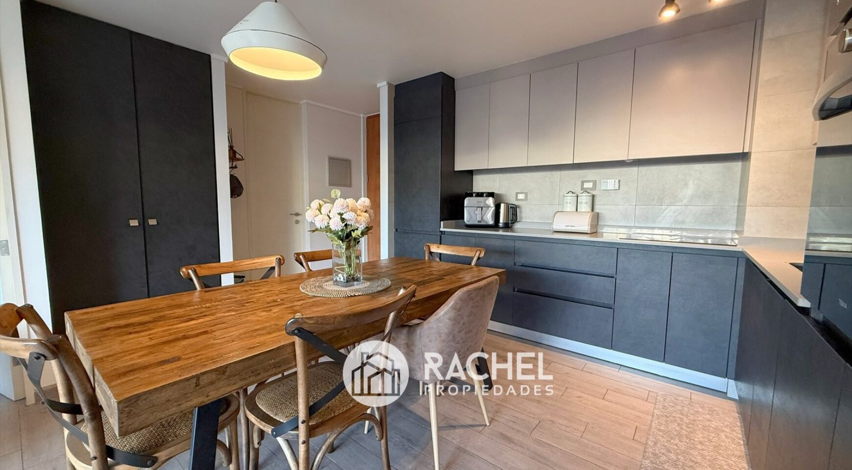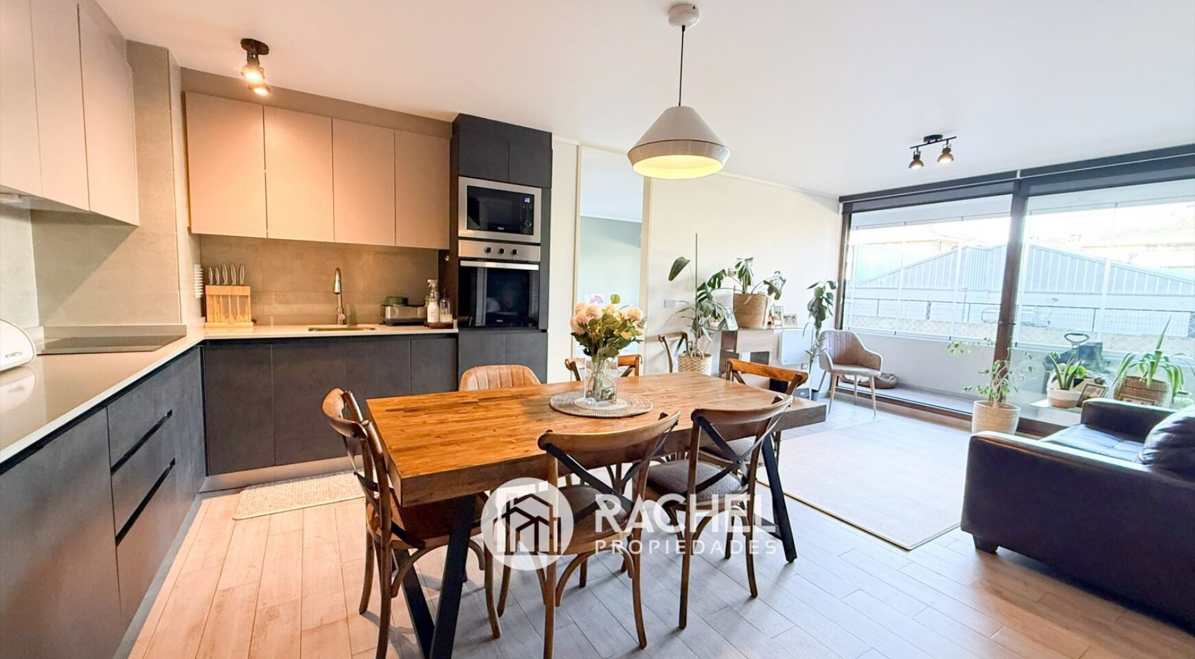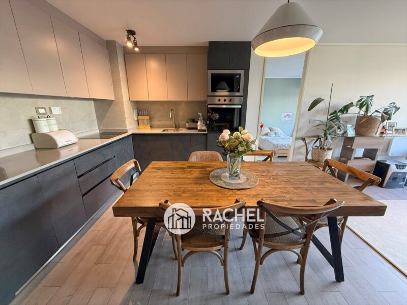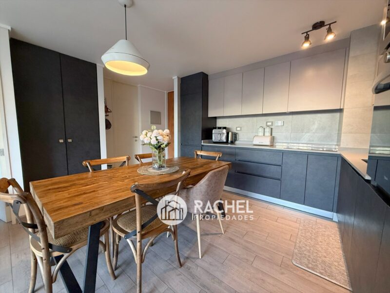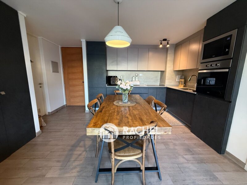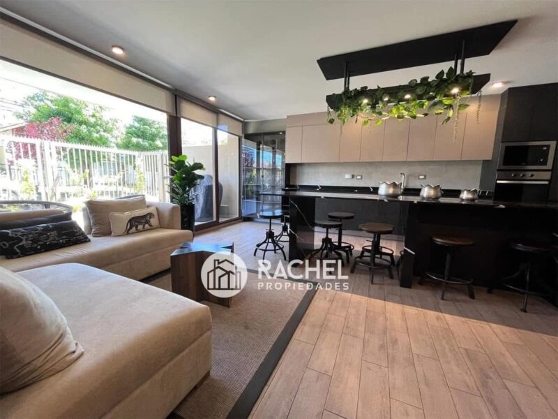 Cocina concepto abierto, con encimera vitrocerámica, horno empotrado, microonda, refrigerador empotrado y campana tipo extractor.