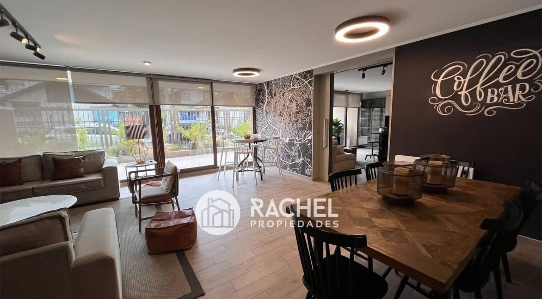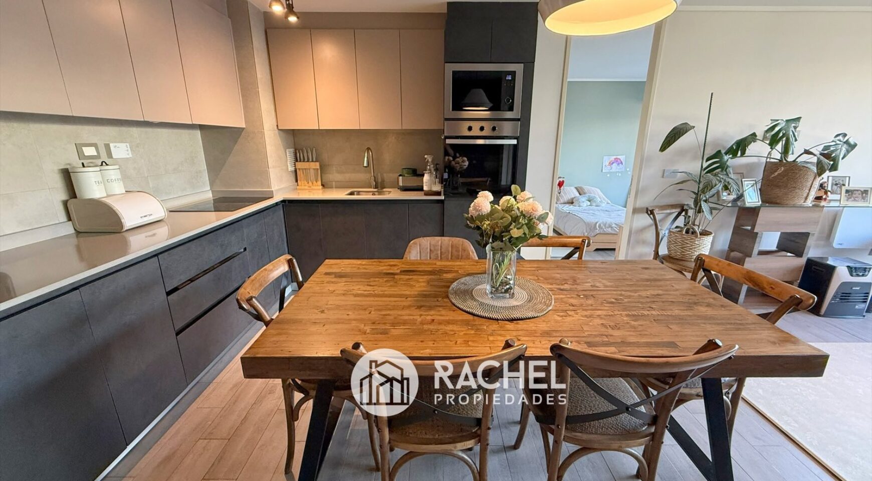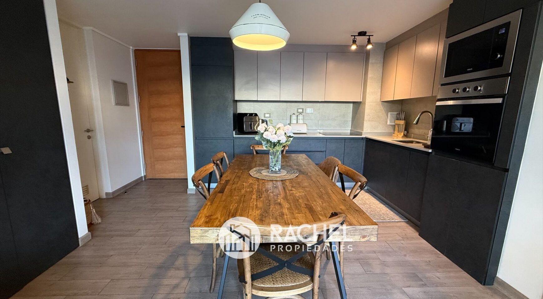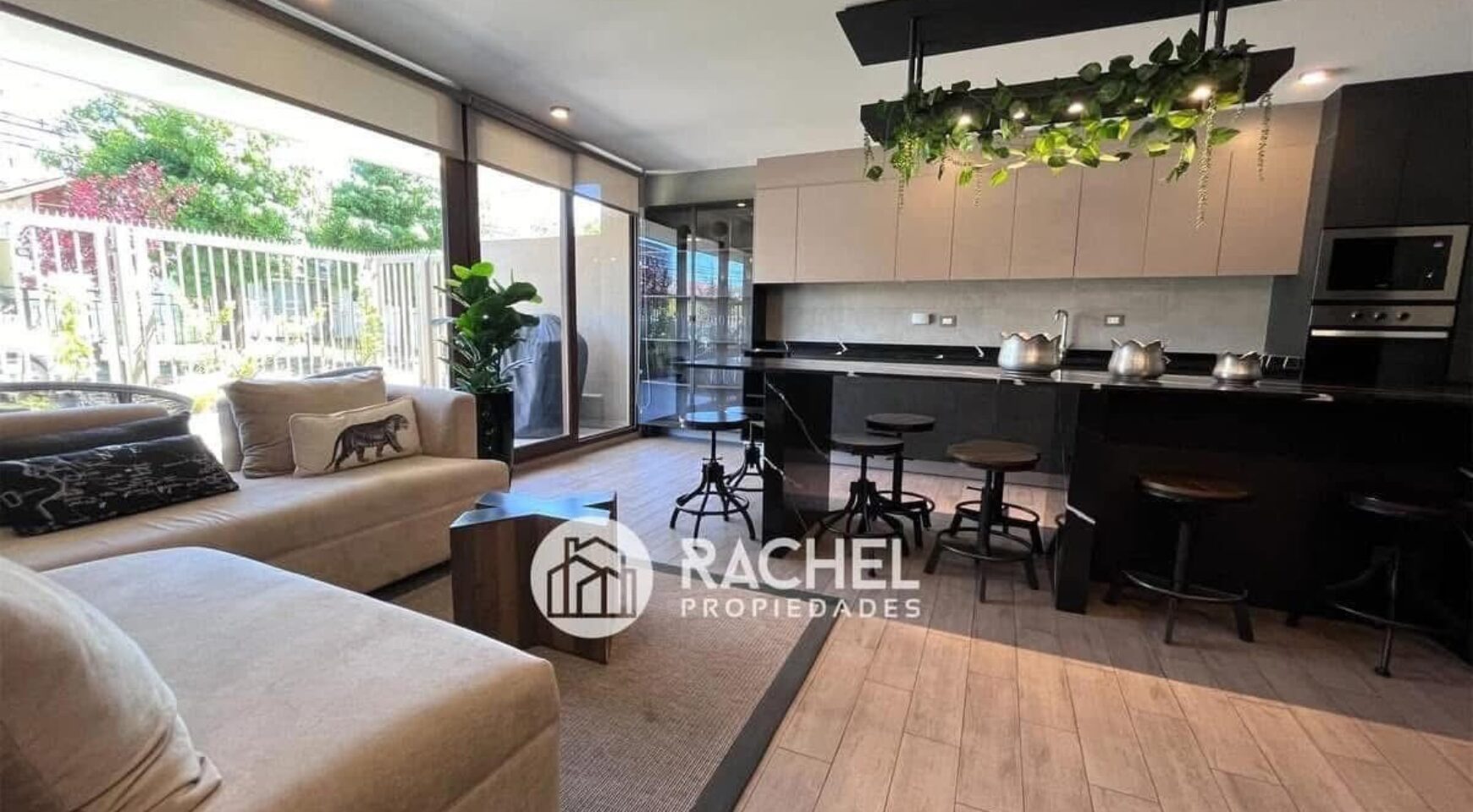 Cocina concepto abierto, con encimera vitrocerámica, horno empotrado, microonda, refrigerador empotrado y campana tipo extractor.