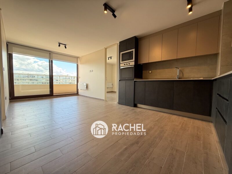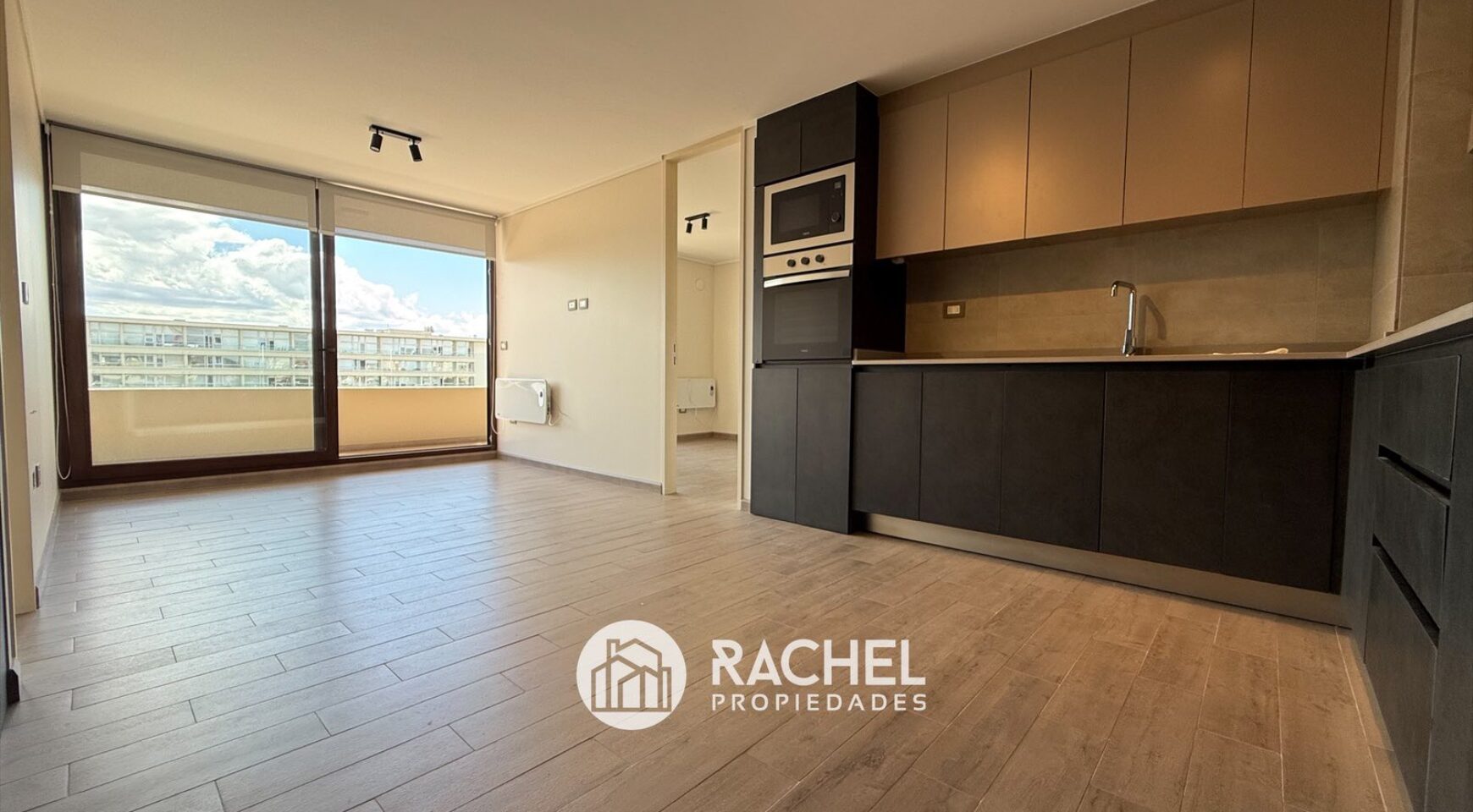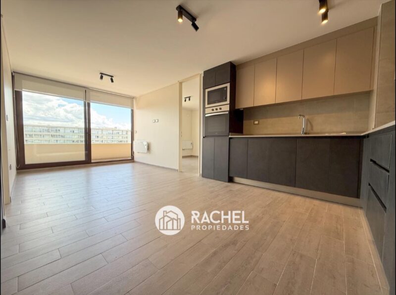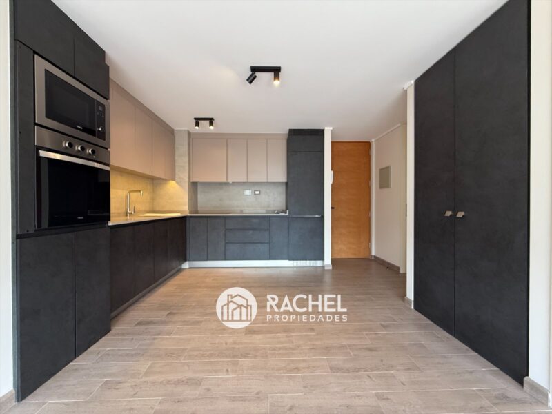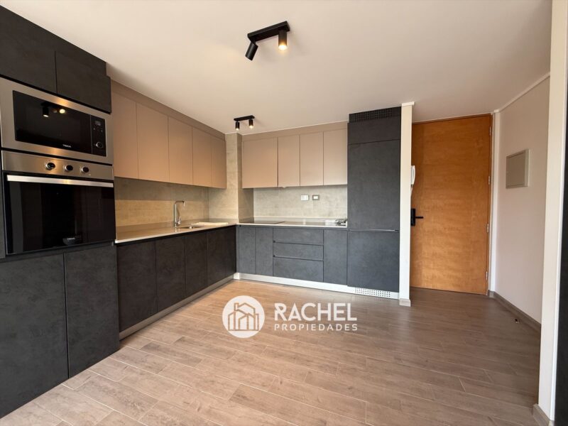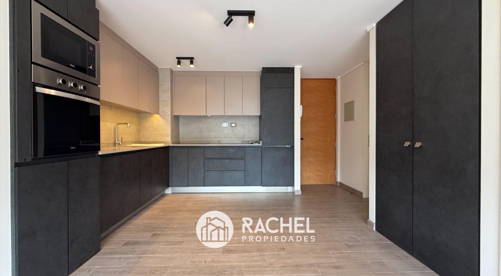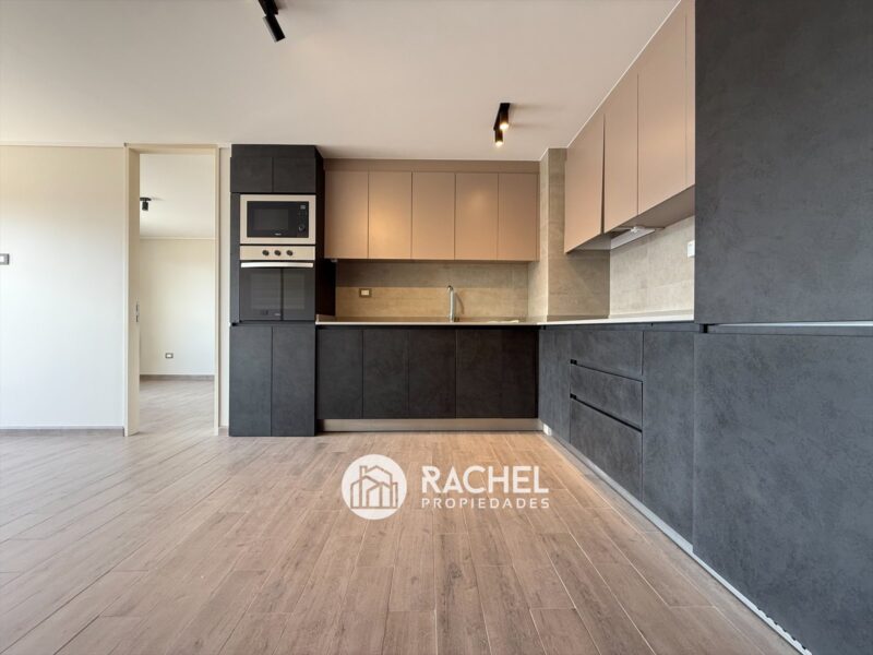 Cocina concepto abierto, con encimera vitrocerámica, horno empotrado, microonda, refrigerador empotrado y campana tipo extractor.