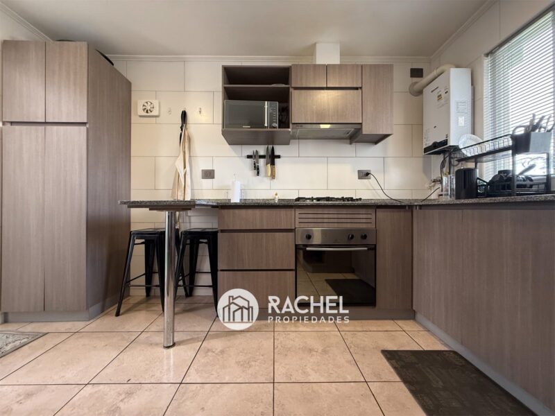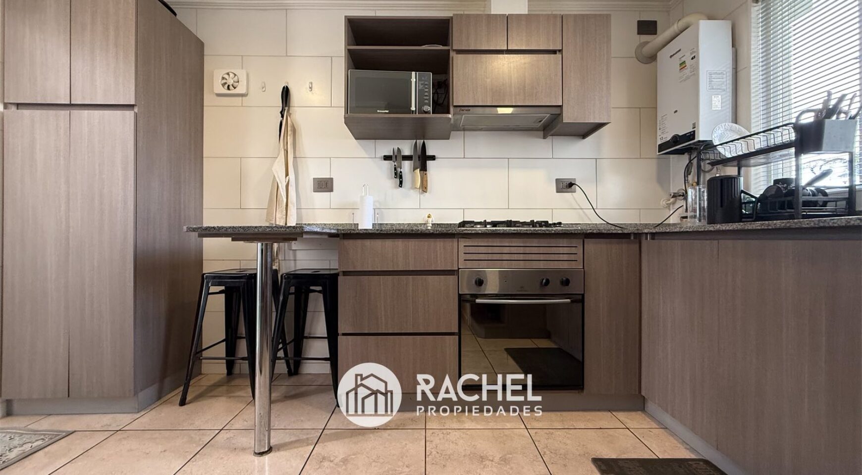 Cocina amoblada y equipada con horno, encimera, campana, desayunador y conexión para lavadora