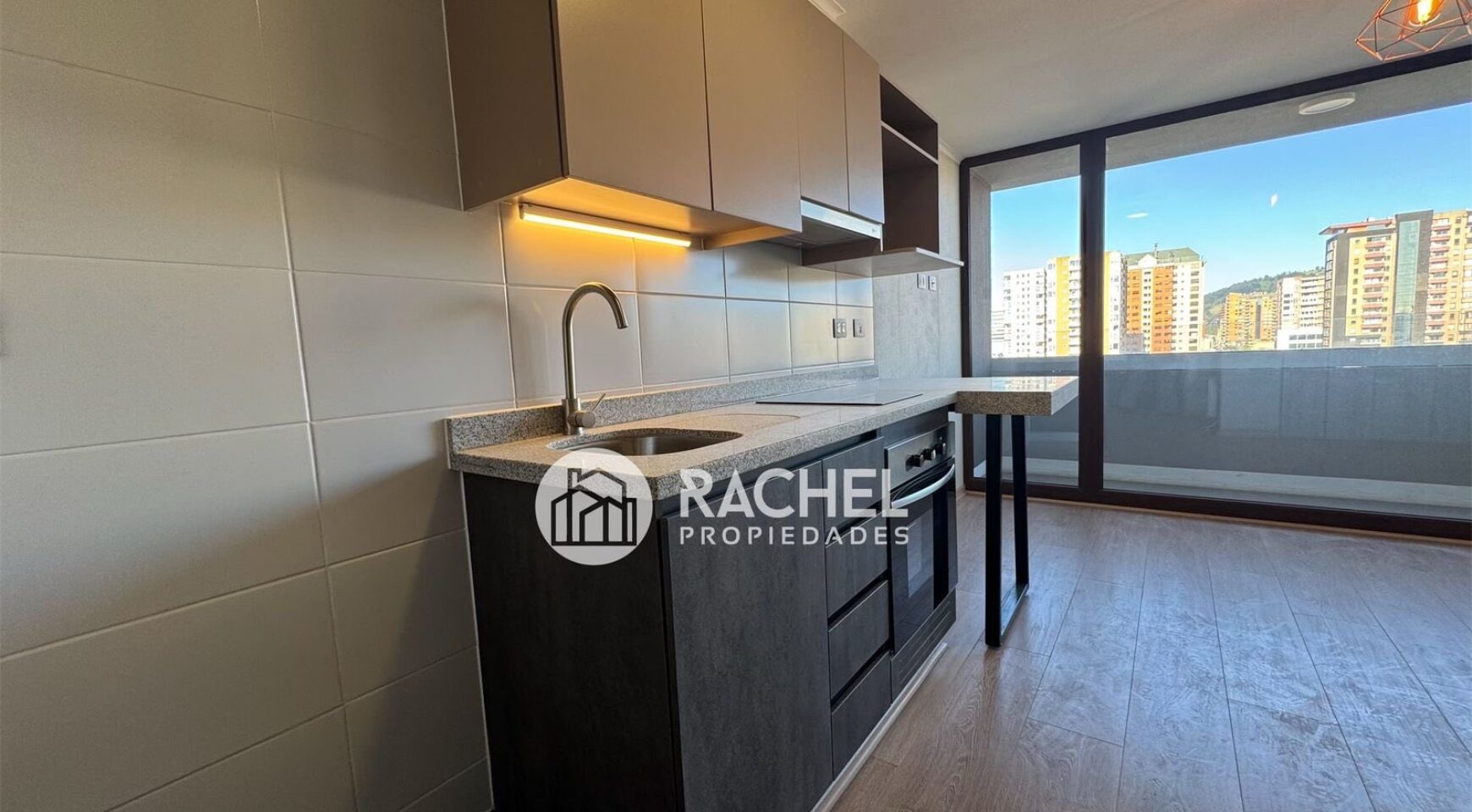 Cocina amoblada, con cubierta de granito, equipada con encimera vitrocerámica, horno eléctrico y campana extractora.