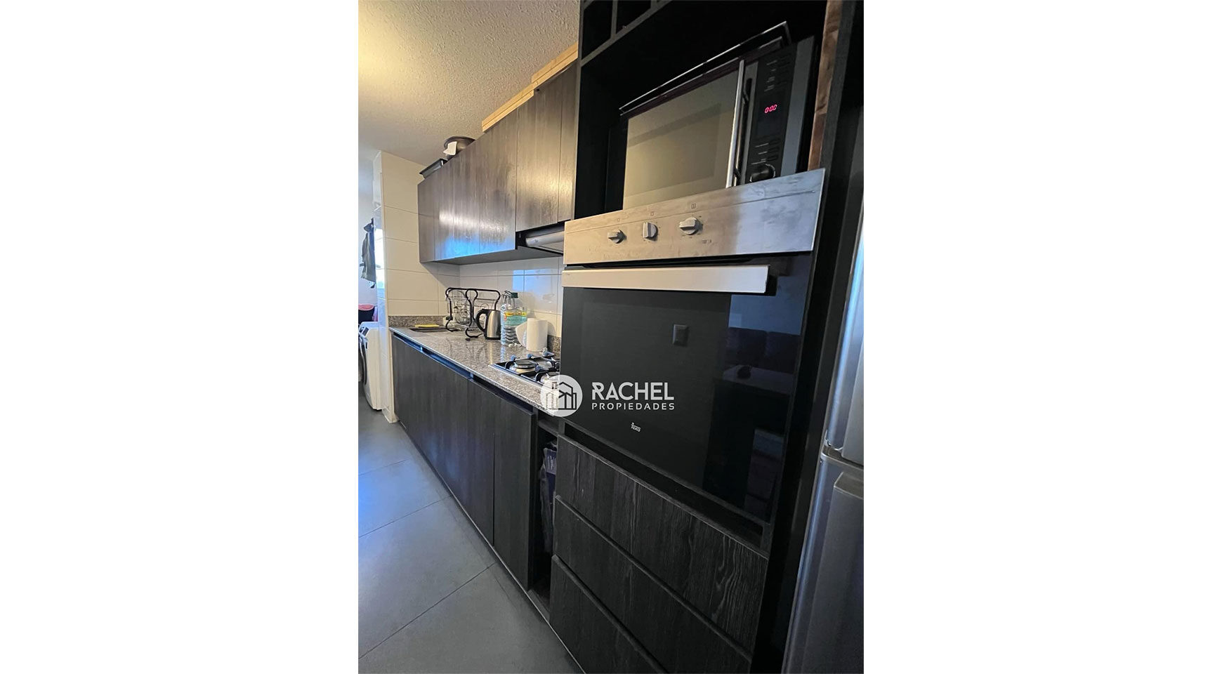 cocina semi cerrada , equipada con horno, encimera y campana. Logia incorporada