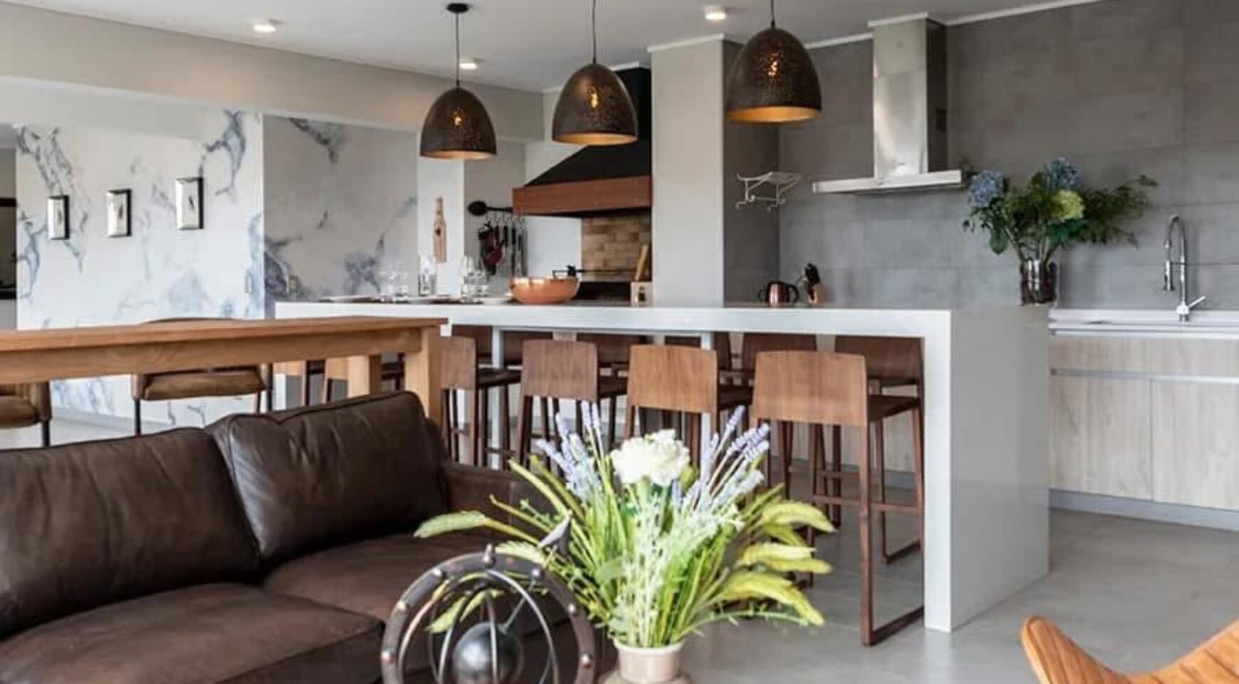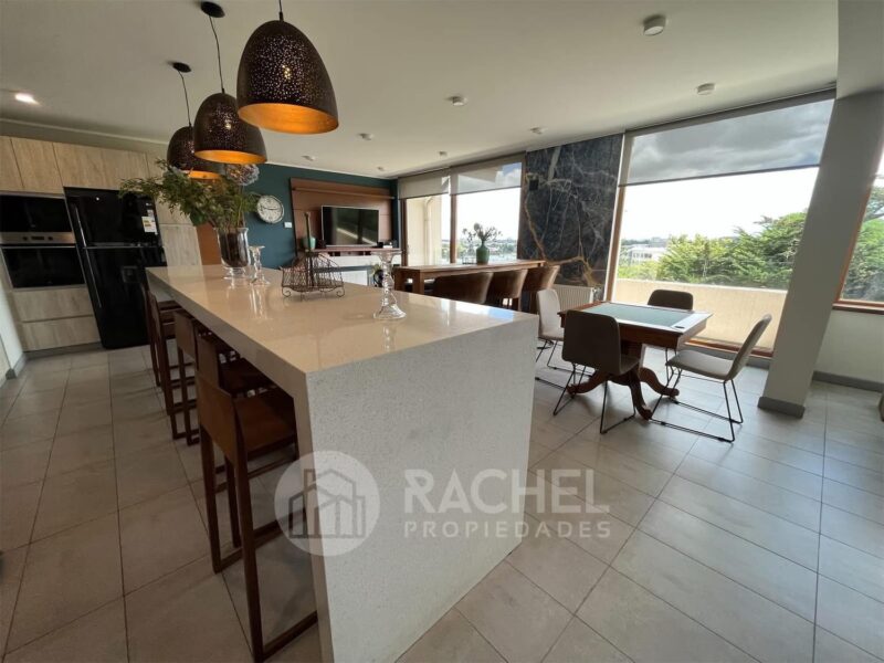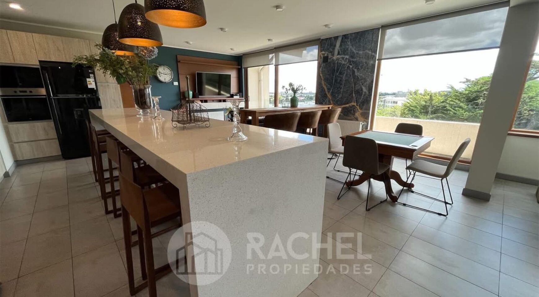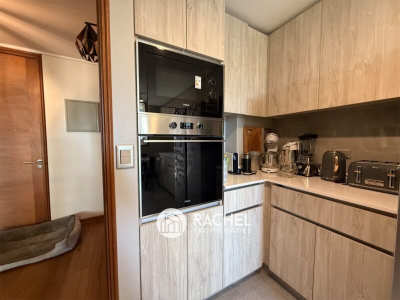 Hall de acceso, cocina cerrada equipada con encimera, campana extractora, horno eléctrico, microondas, lavavajillas, espacio para refrigerador side by side, cubiertas de cuarzo, comedor de diario, logia independiente que incluye lavadero y planchador incorporado.