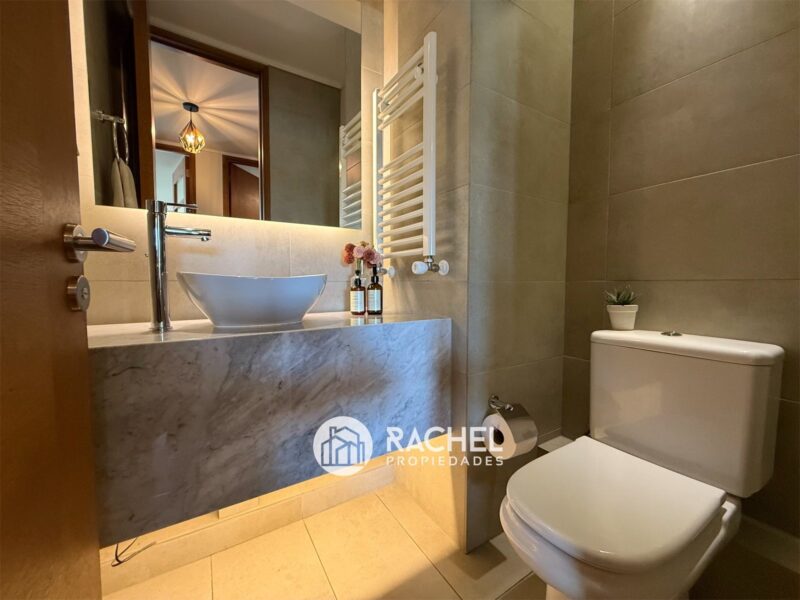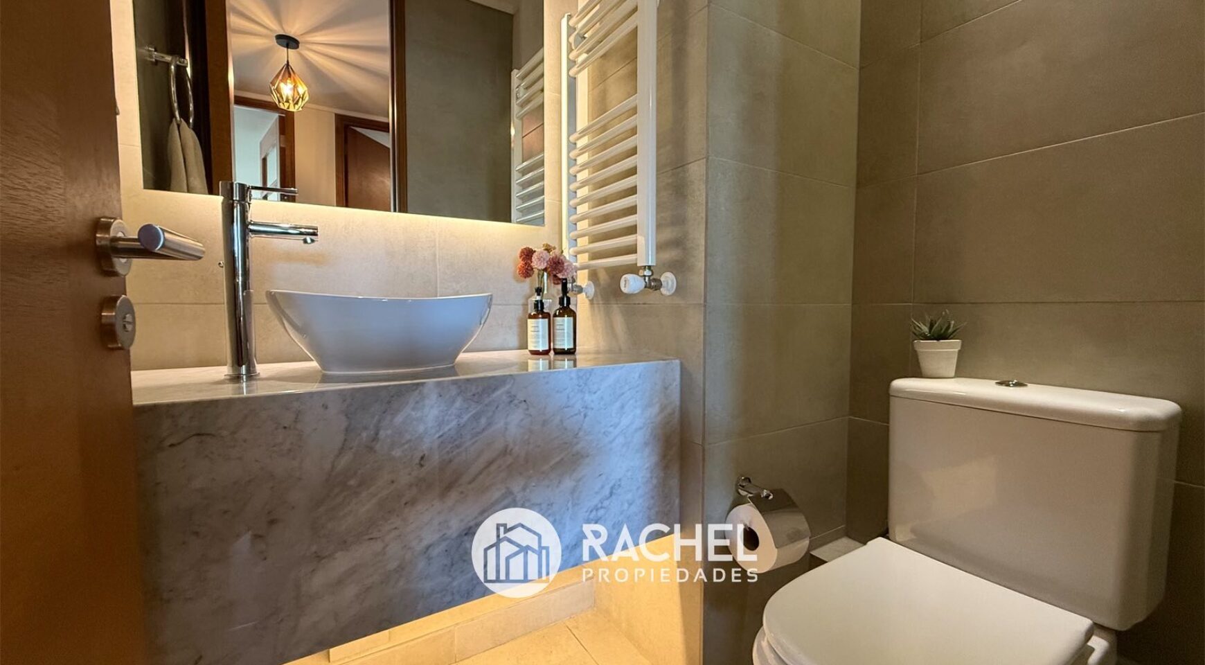 Baño de visitas con vanitorio y cubiertas de mármol.