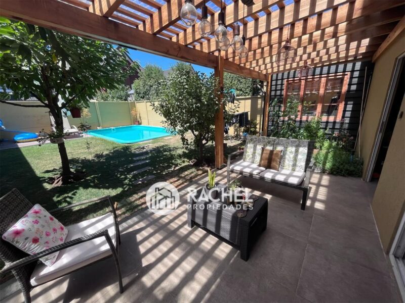 Quincho con cocina, completamente equipado, lindas terminaciones, vigas a la vista, baño y aire acondicionado. Piscina climatizada, jardín formado, riego automático. Bodega de muy buen tamaño.