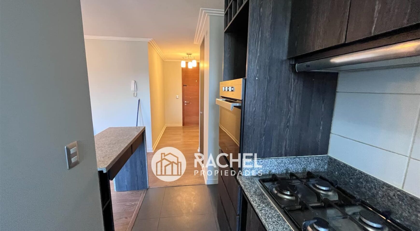 cocina equipada con horno, encimera empotrada y campana. Logia