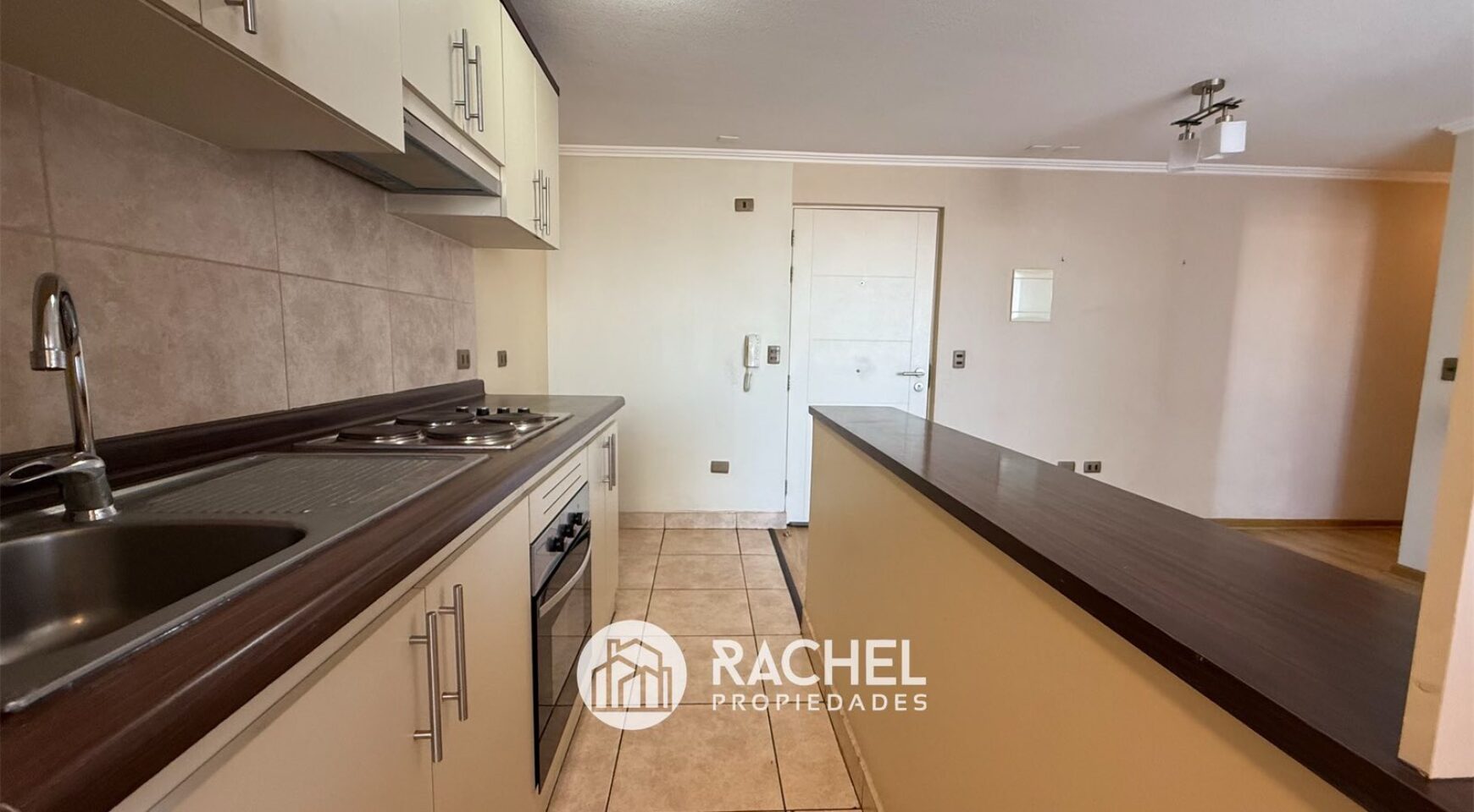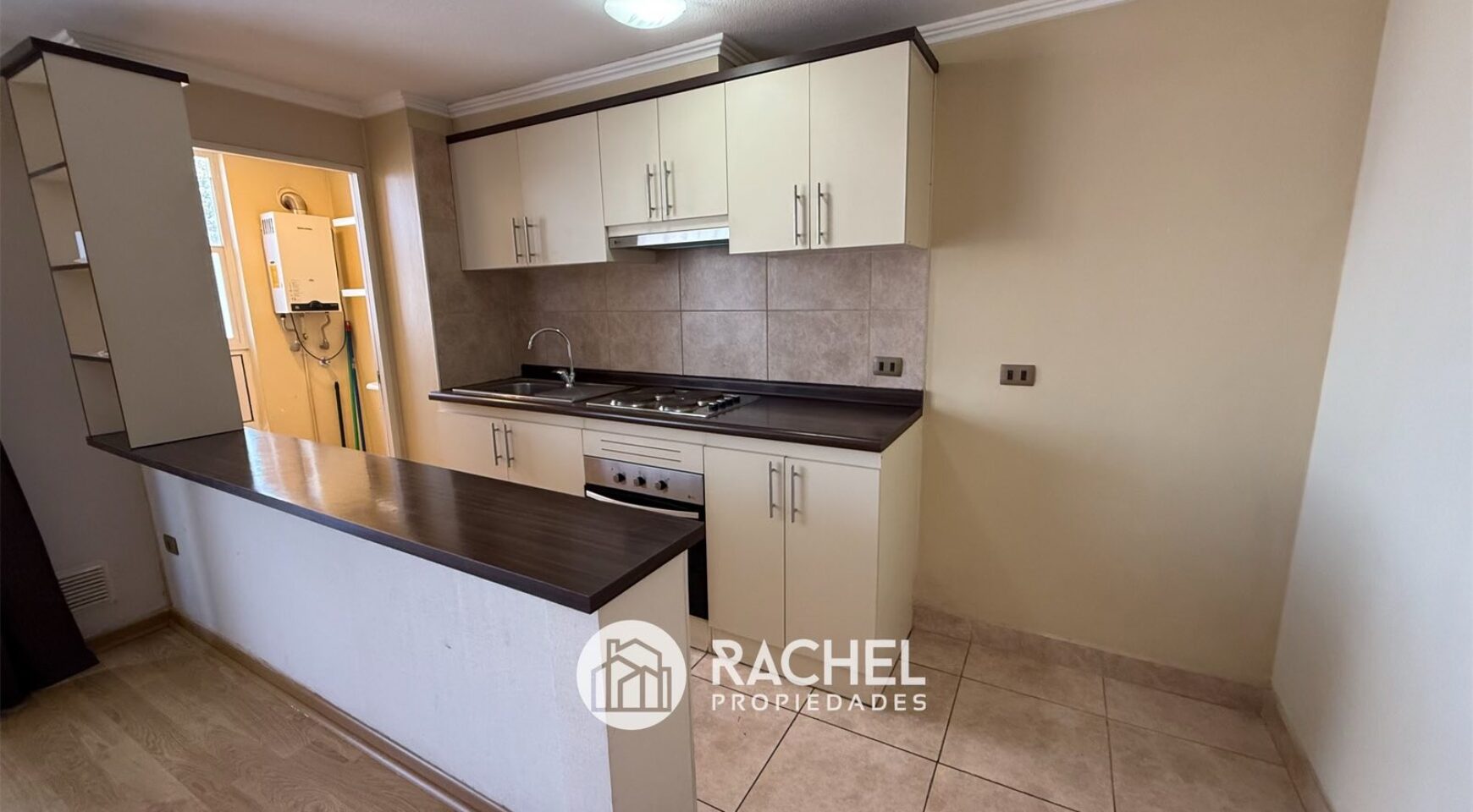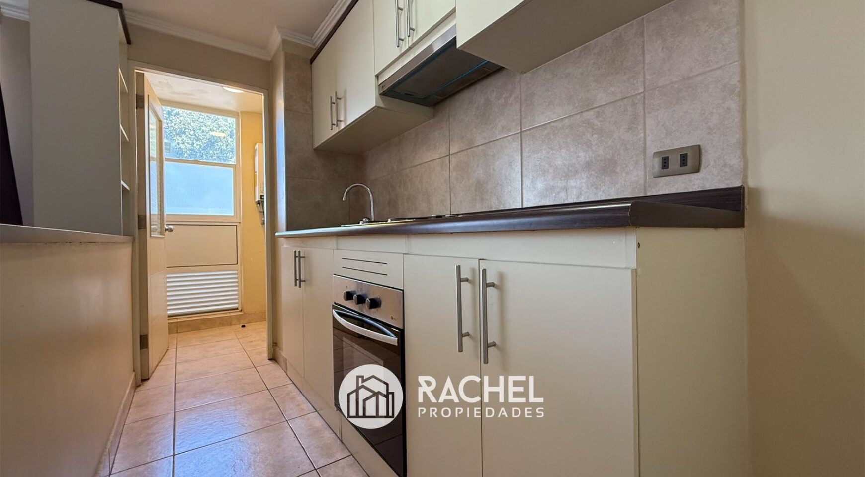 Cocina amoblada y equipada con horno, encimera y campana, logia separada