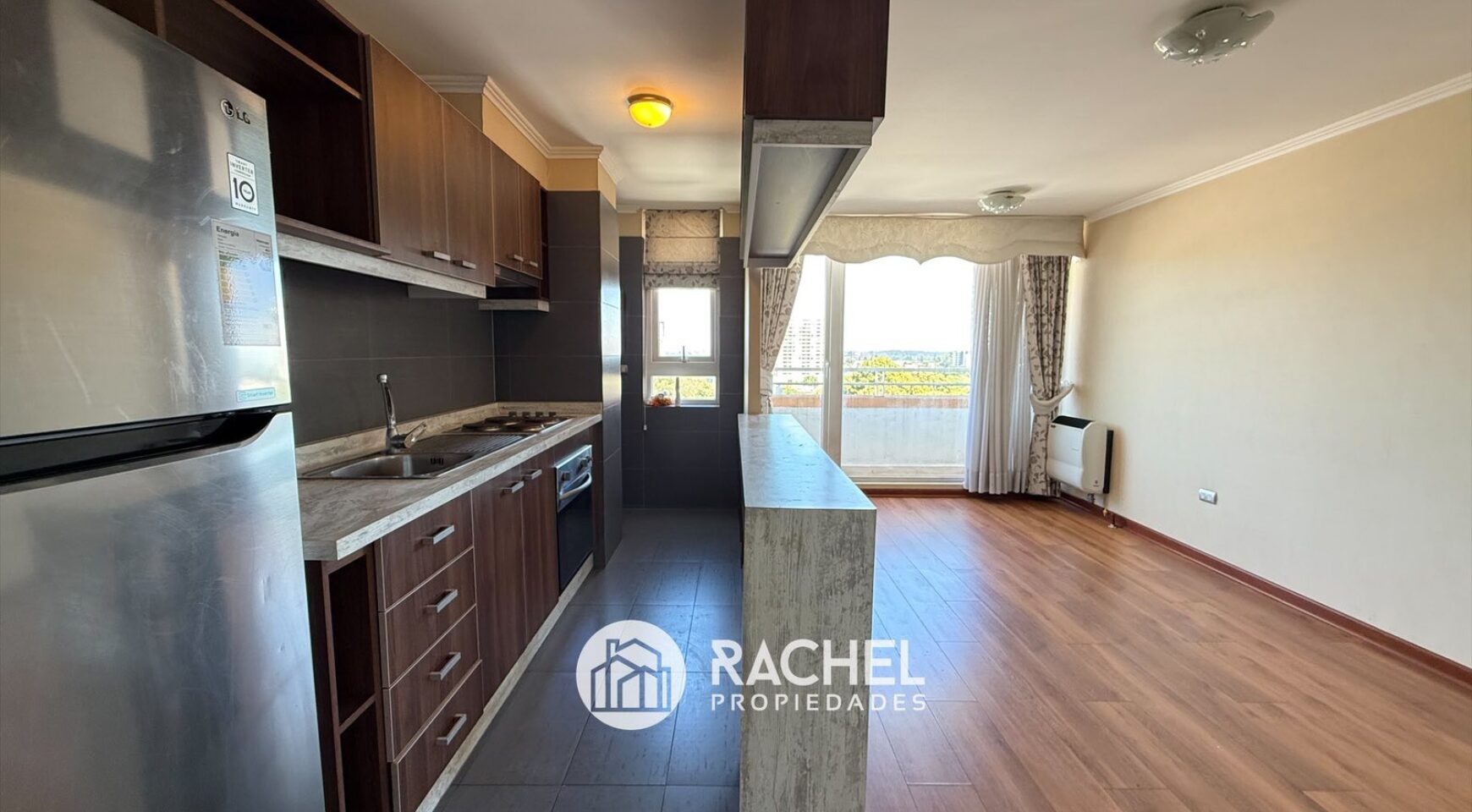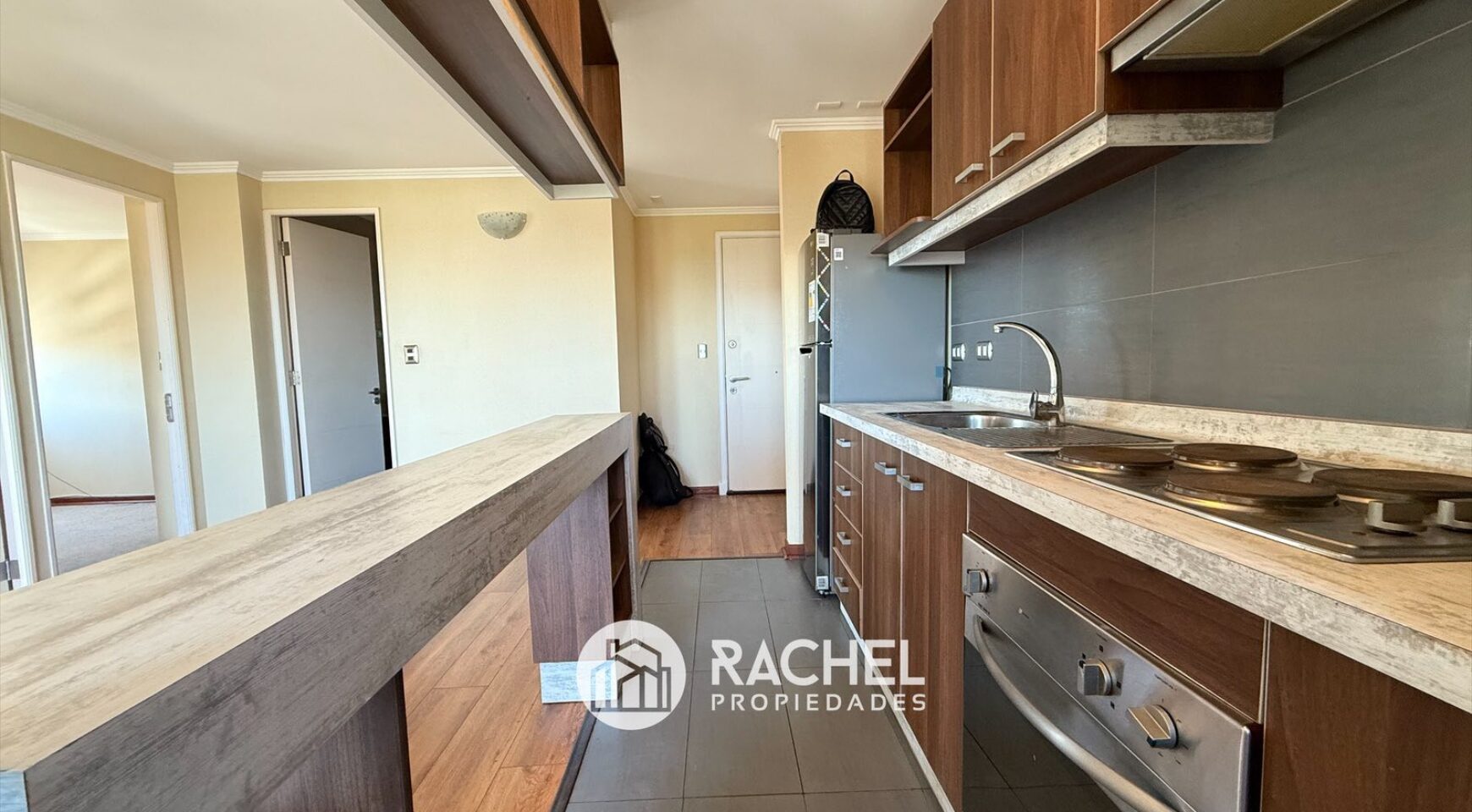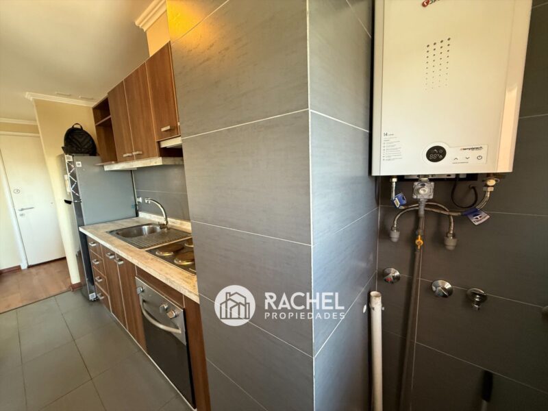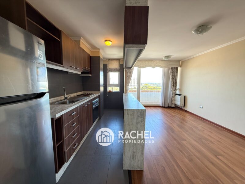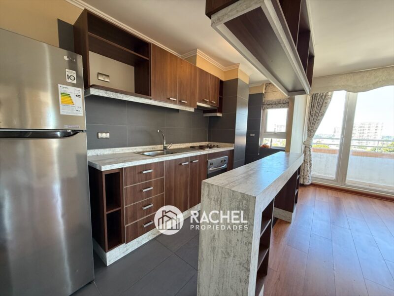 Cocina semi integrada, amoblada y equipada con encimera horno y campana