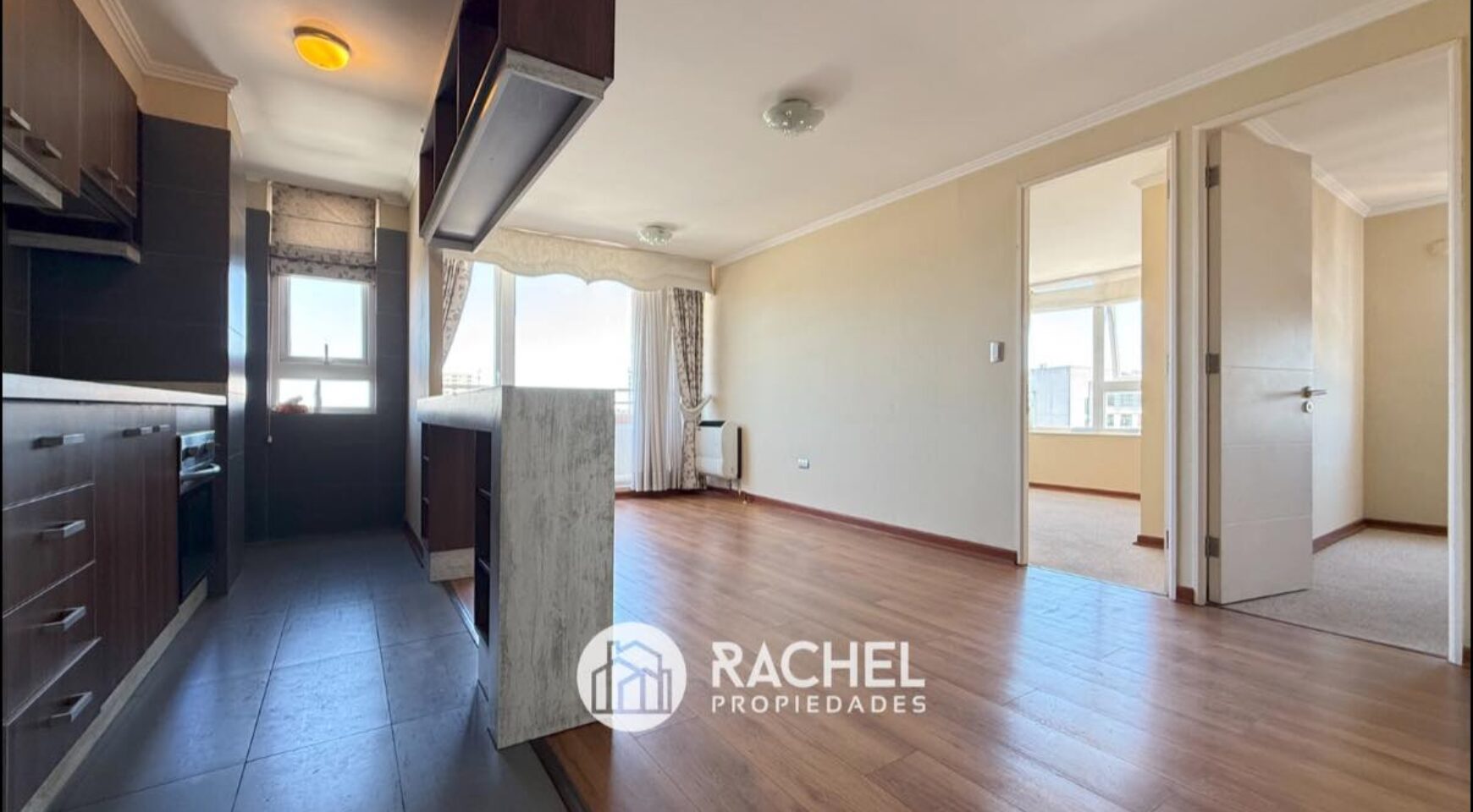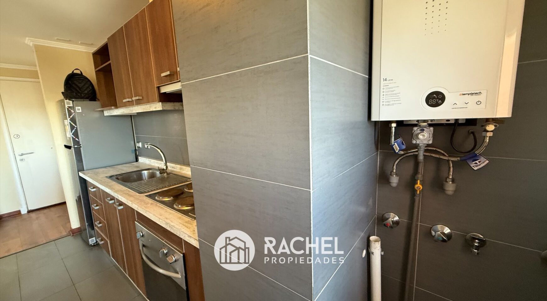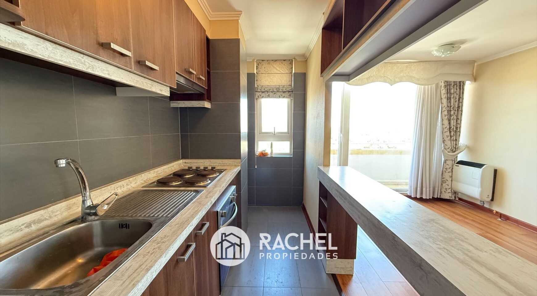 Cocina semi integrada, amoblada y equipada con encimera horno y campana