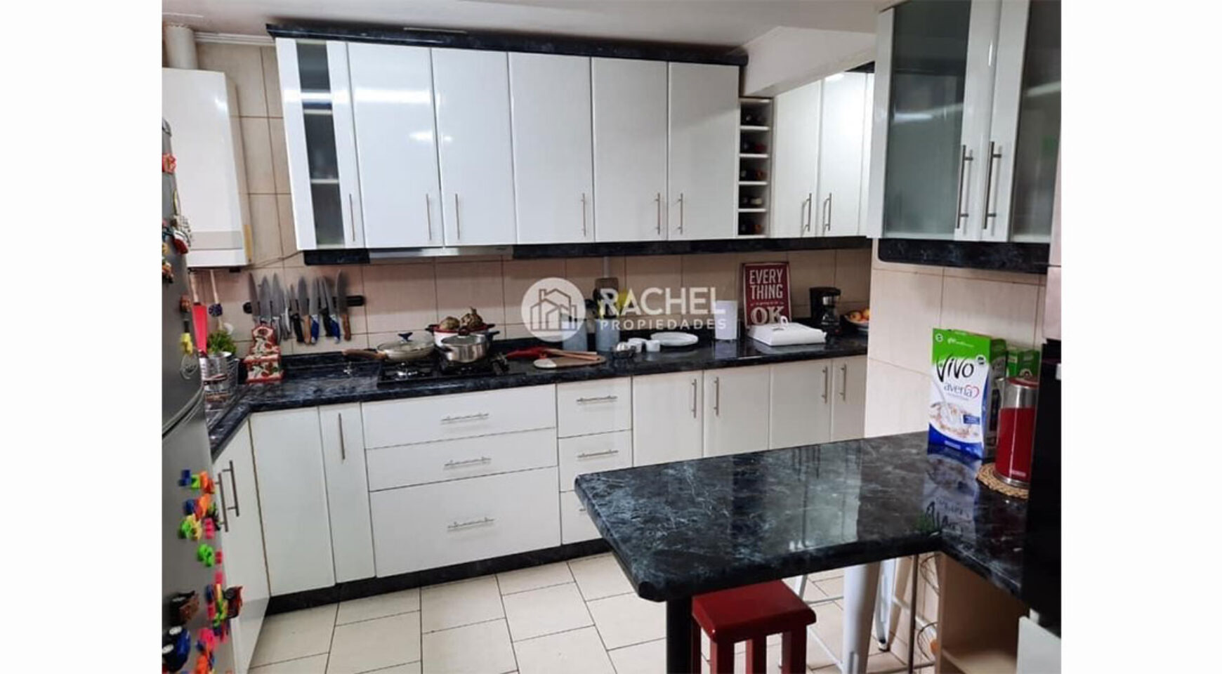 Amplio hall de acceso, piso de piedra pizarra, baño de visitas, living comedor con salida a linda terraza techada. Sala de estar (o cuarto dormitorio), cocina remodelada, cuenta con horno empotrado, encimera y campana. Todos los muebles son nuevos. Ampliación de cocina, con logia y despensa. Jardín con pasto sintético, de muy buena calidad, bodega con respisas, estacionamiento para dos vehículos