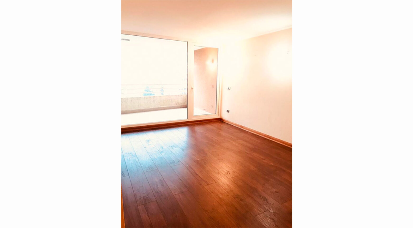 Departamento remodelado con piso flotante, muebles de cocina y closets.