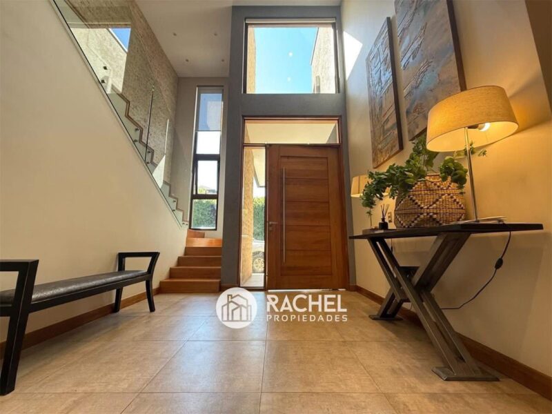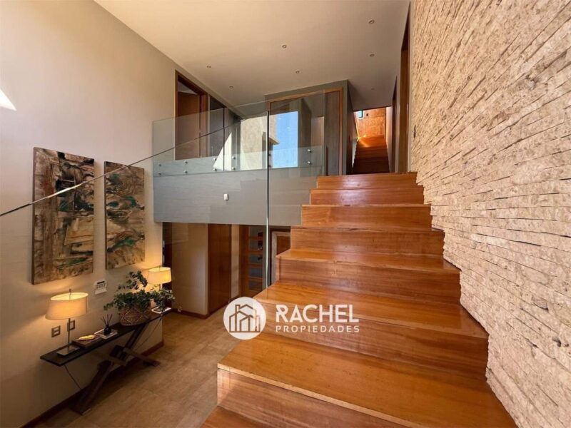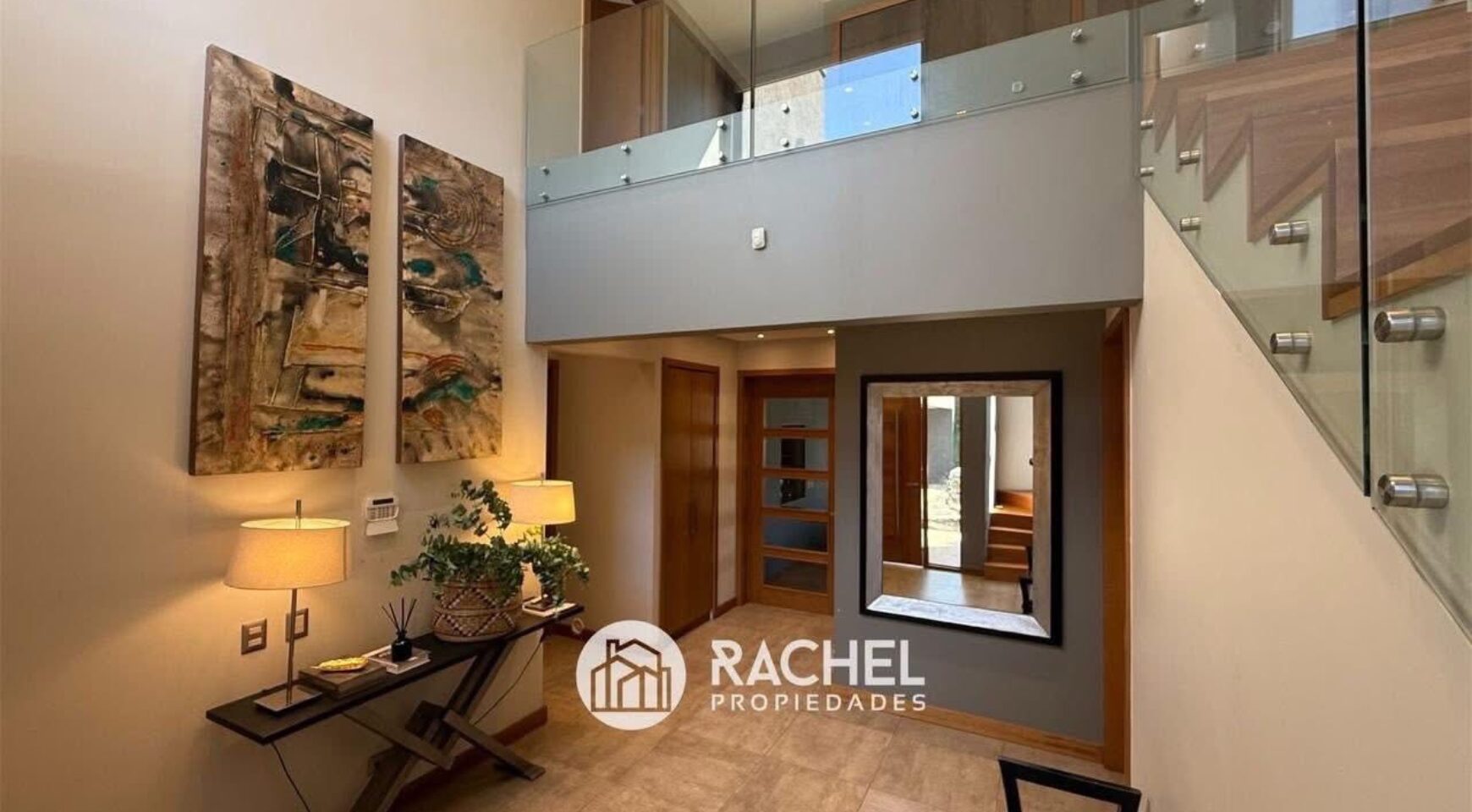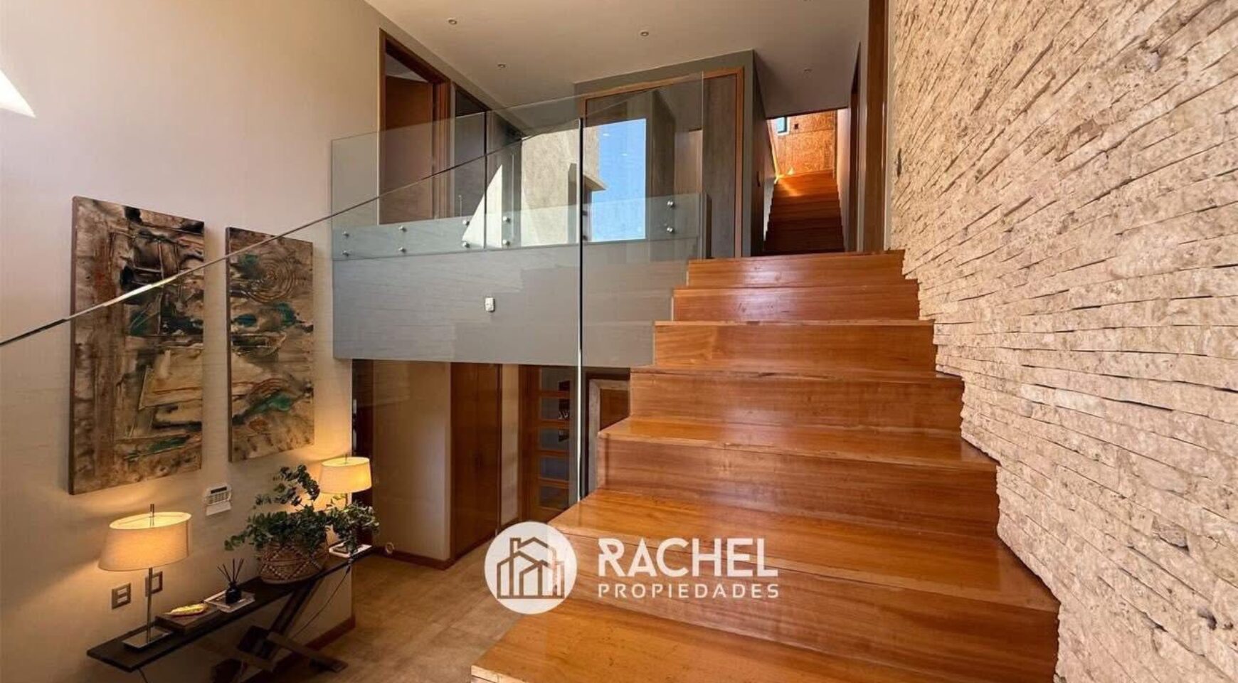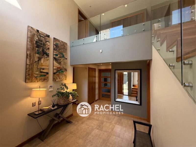 Gran y luminoso hall de entrada con doble altura, barandas de escalera de cristal templado