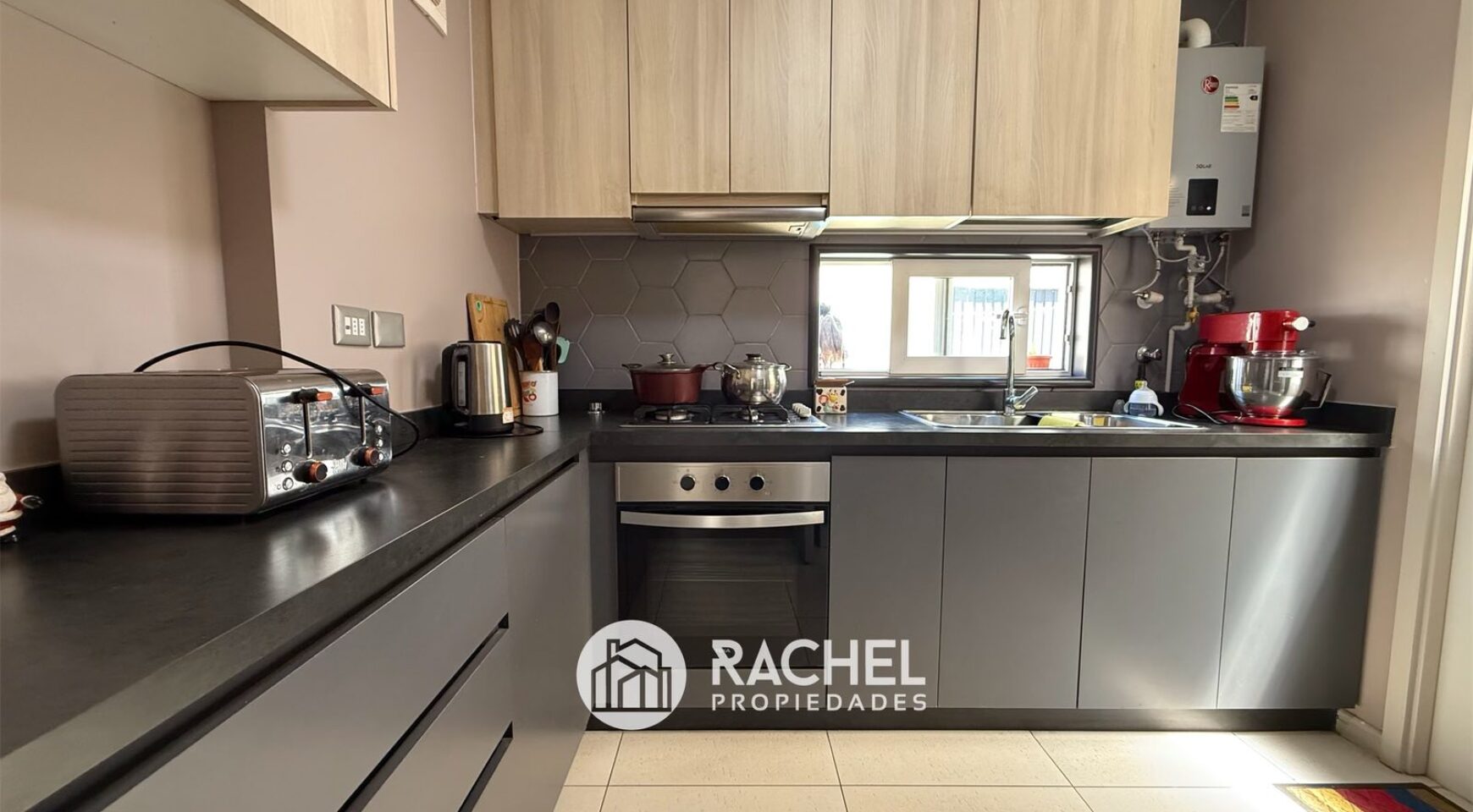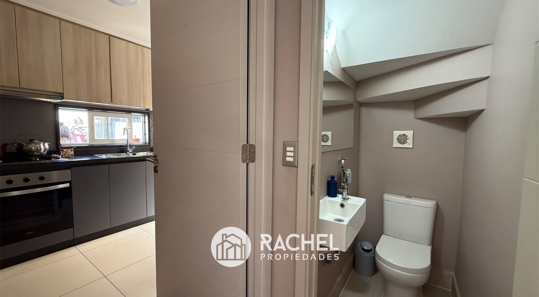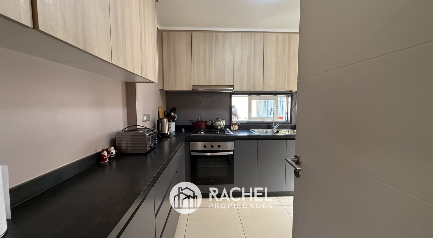Cocina cerrada, equipada con horno, encimera, campana y conexión para lavadora